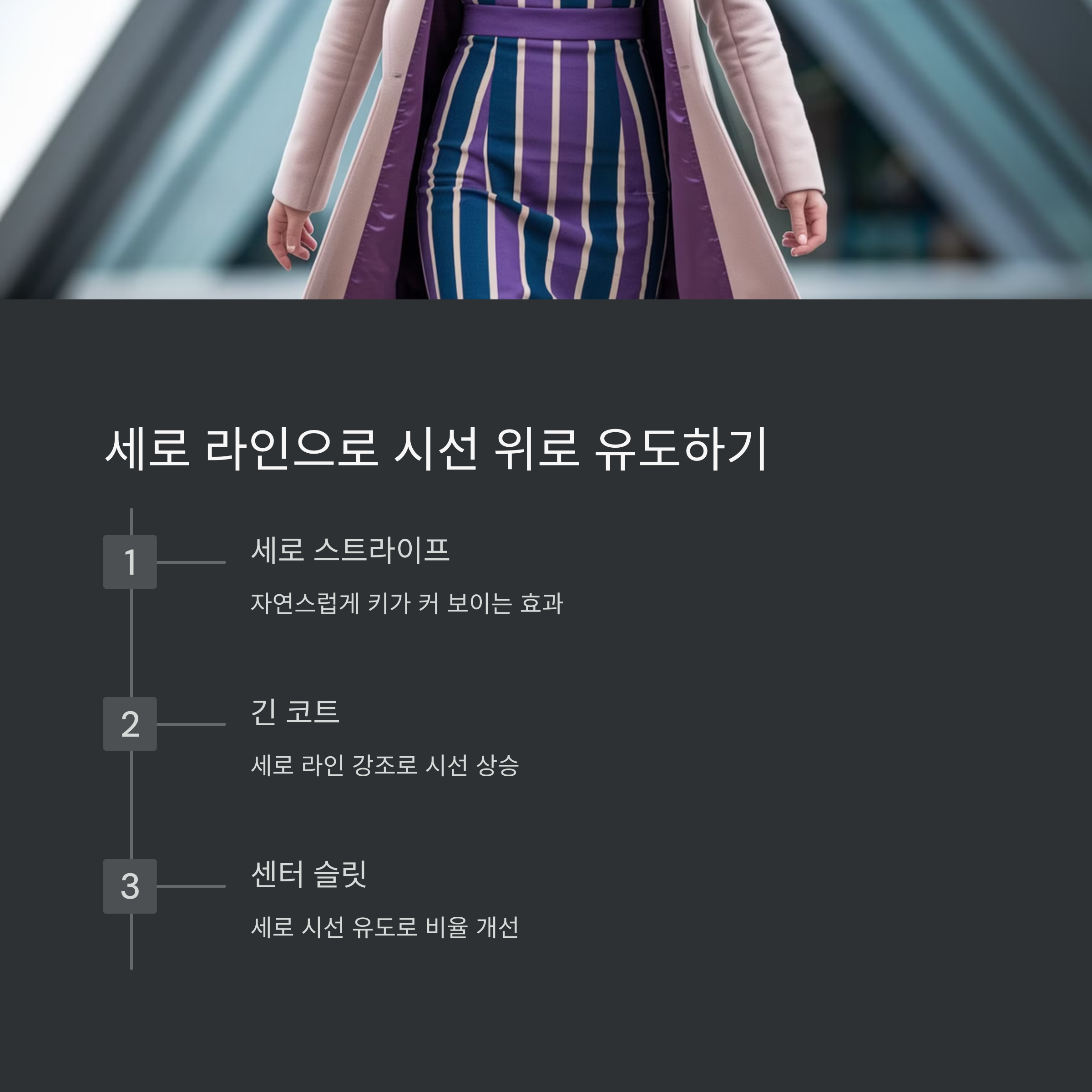 - 세로 라인 강조: 스트라이프 패턴, 롱코트 활용
