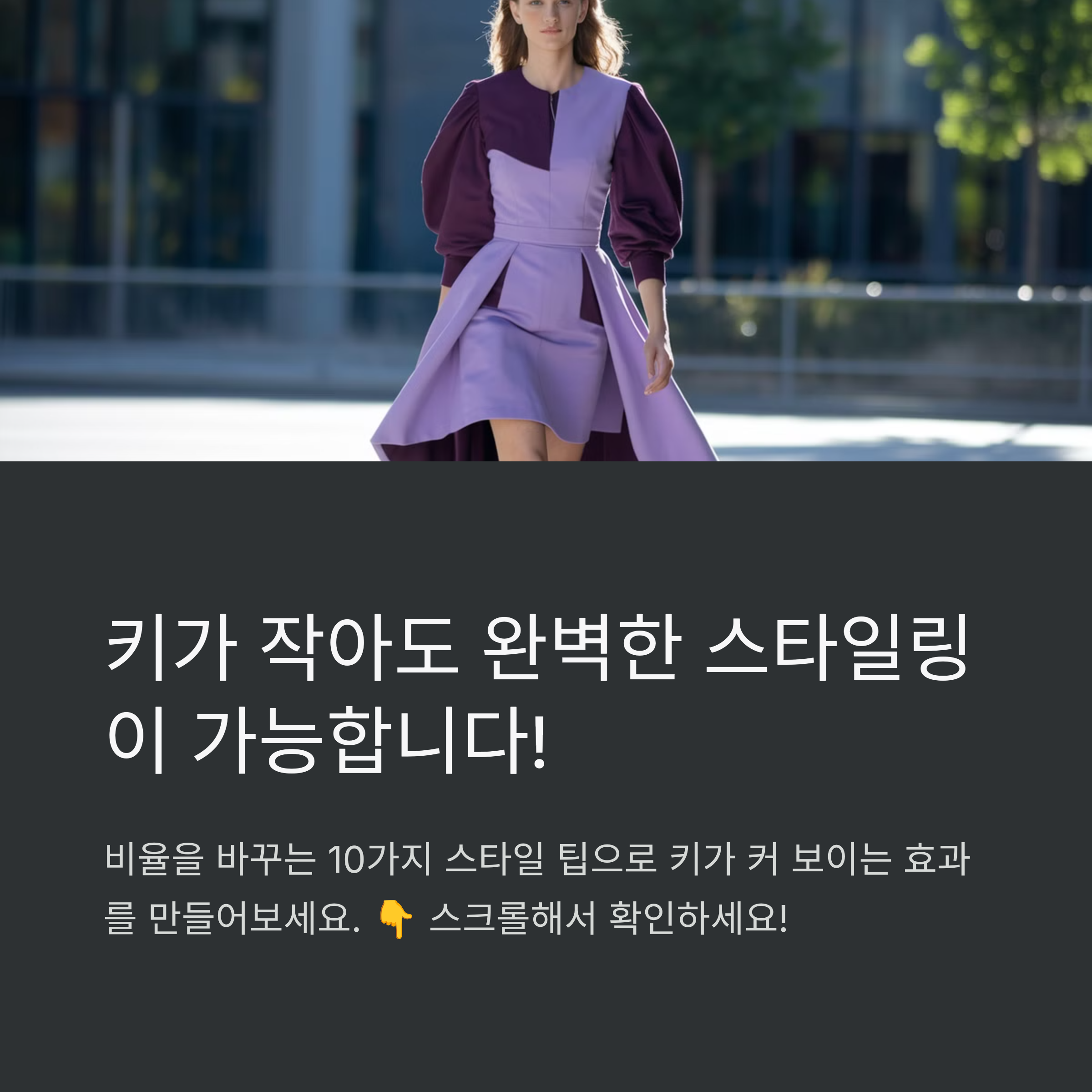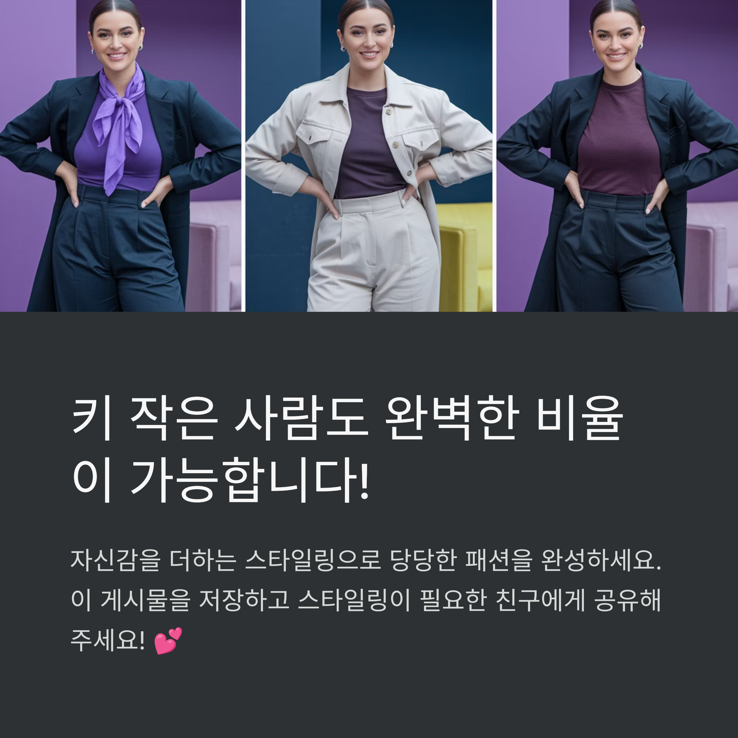 키가 작은 사람도 스타일링 공식만 알면 비율을 살려 키가 커 보일 수 있습니다. 자신에게 맞는 스타일을 찾아 더욱 세련된 패션을 즐겨보세요!