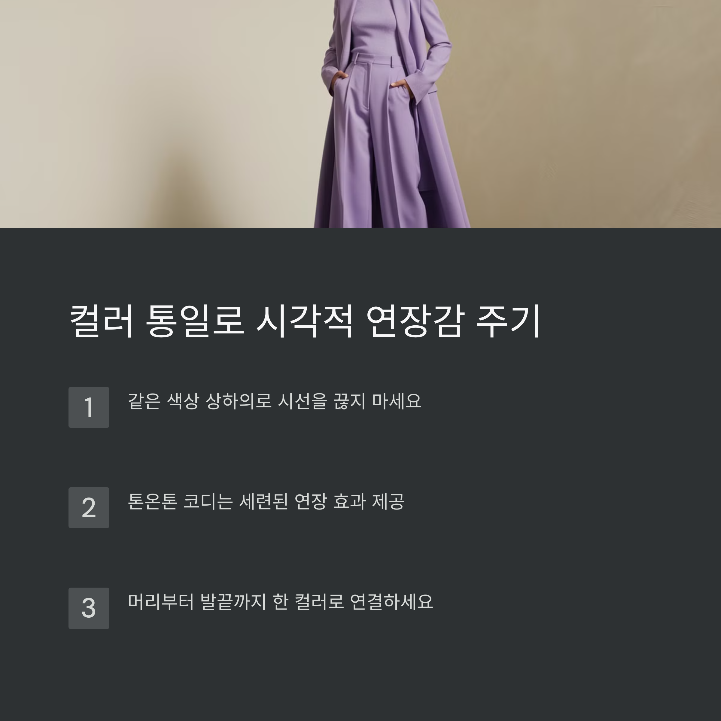 - 상·하의 컬러 통일: 같은 계열 색상으로 통일해 시각적 연장 효과