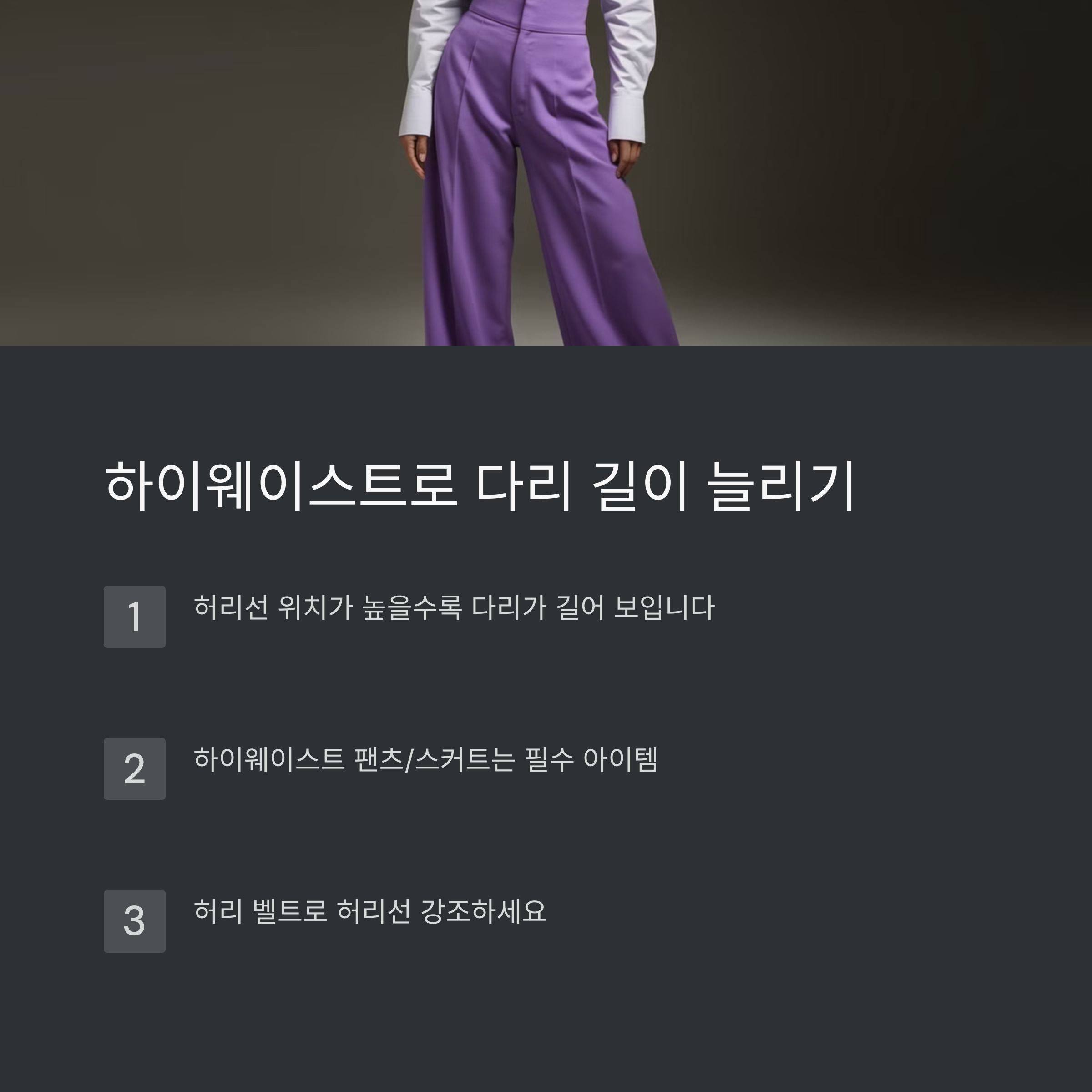 - 하이웨이스트 활용: 허리선을 높여 다리를 길어 보이게