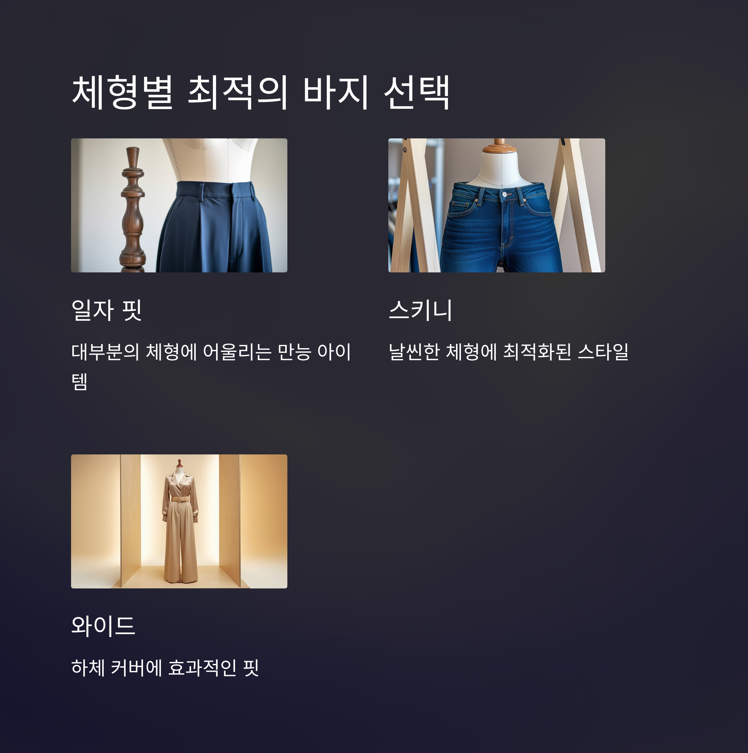 - 엉덩이가 작은 체형: 포켓 디테일이 있는 팬츠로 볼륨감 연출.