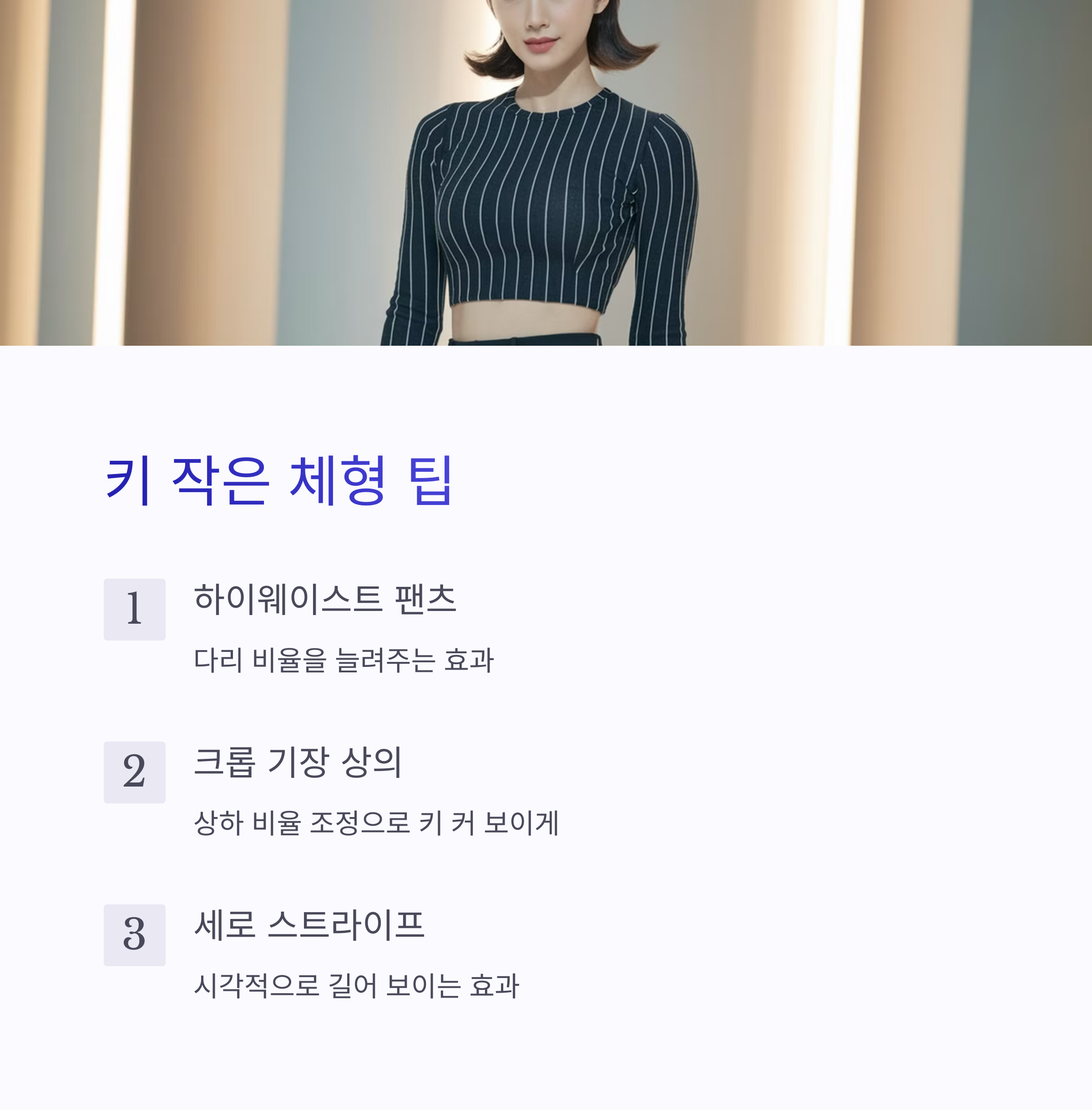 - 키 작은 체형: 하이웨이스트 팬츠, 크롭 기장의 상의, 미니멀한 코디.