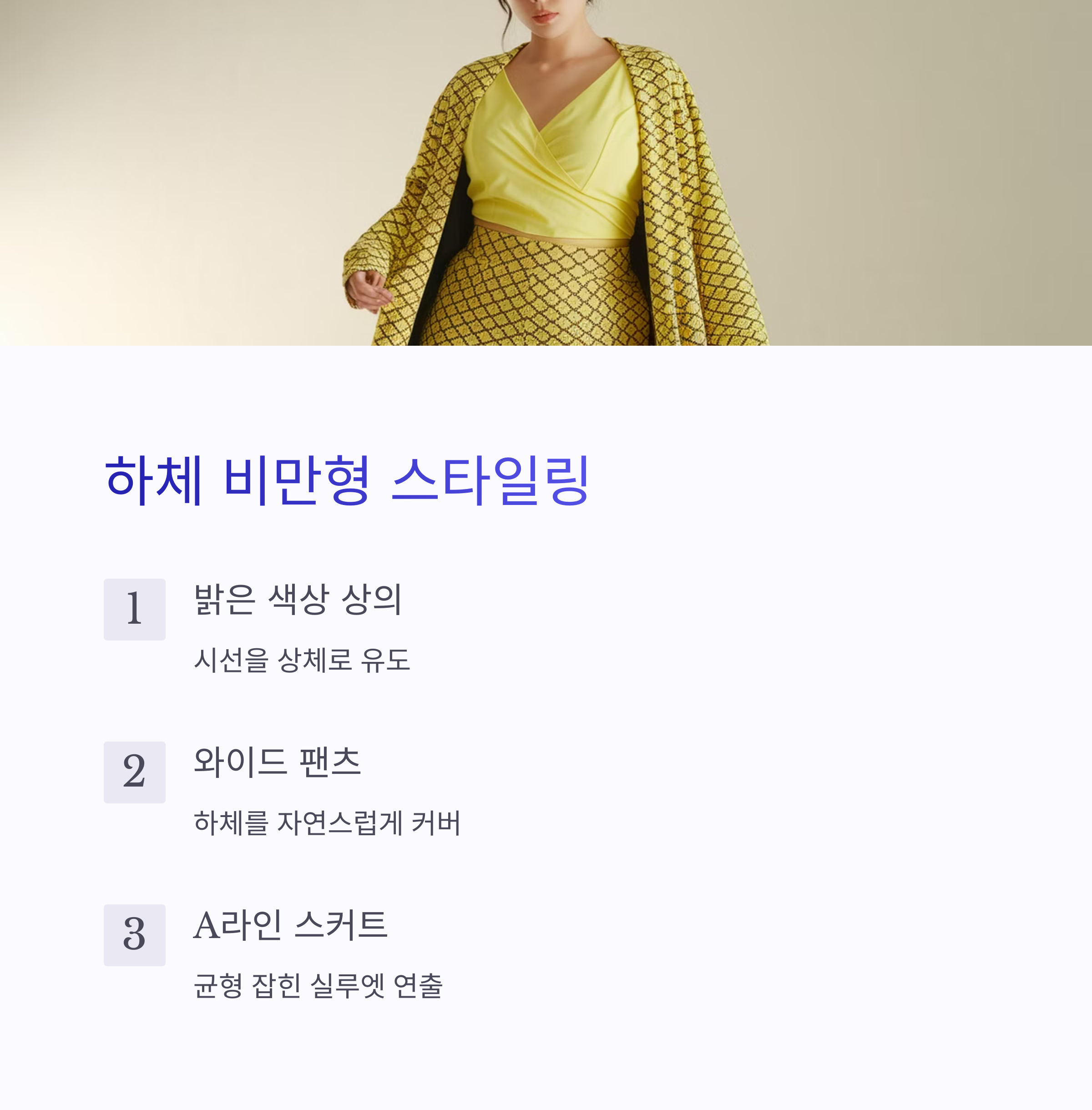 - 하체 비만형: H라인 스커트, 롱 와이드 팬츠, 밝은 컬러 상의 코디.