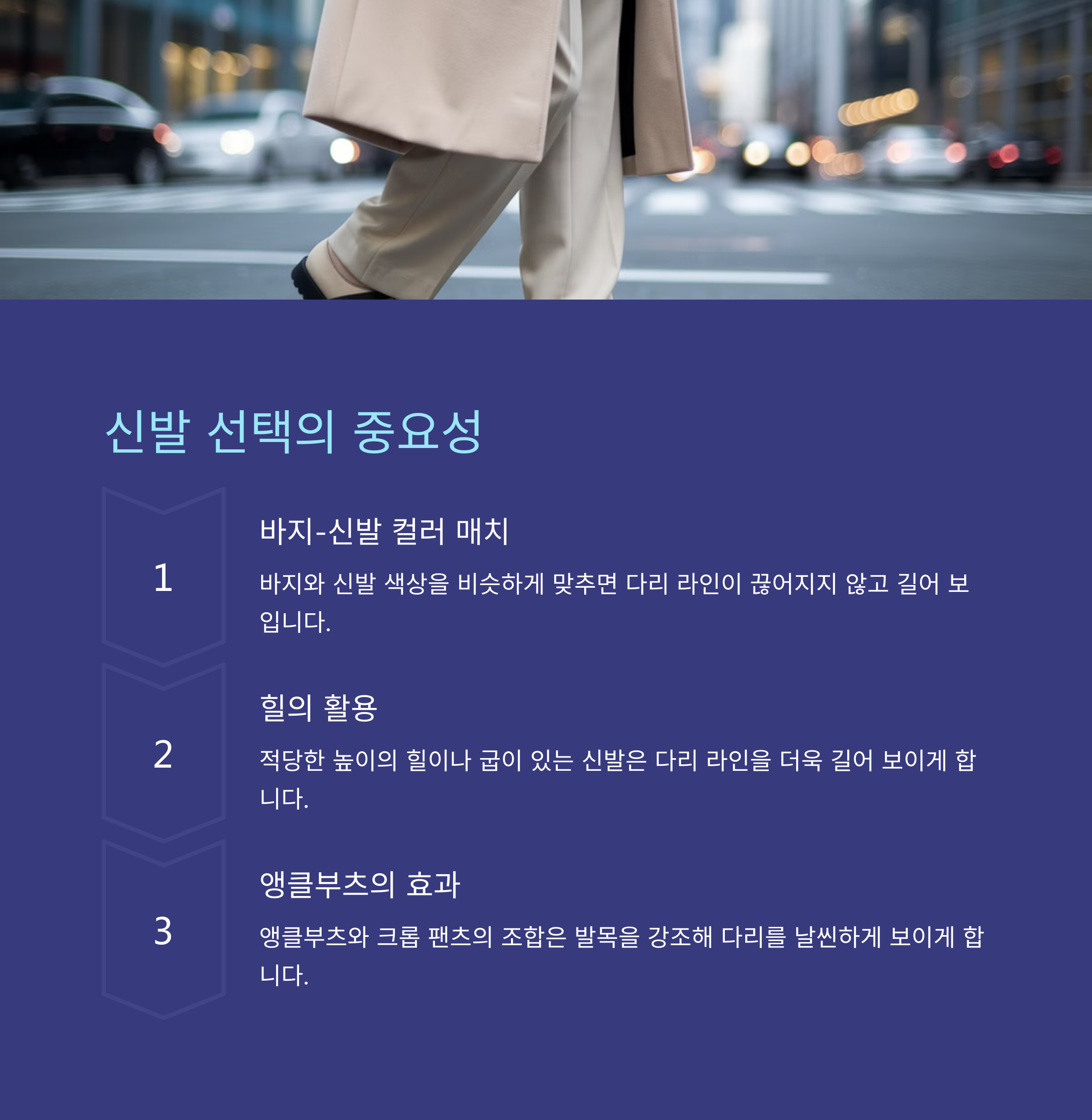 - 스타일링 팁: 어두운 컬러의 바지와 밝은 상의로 시선을 분산.