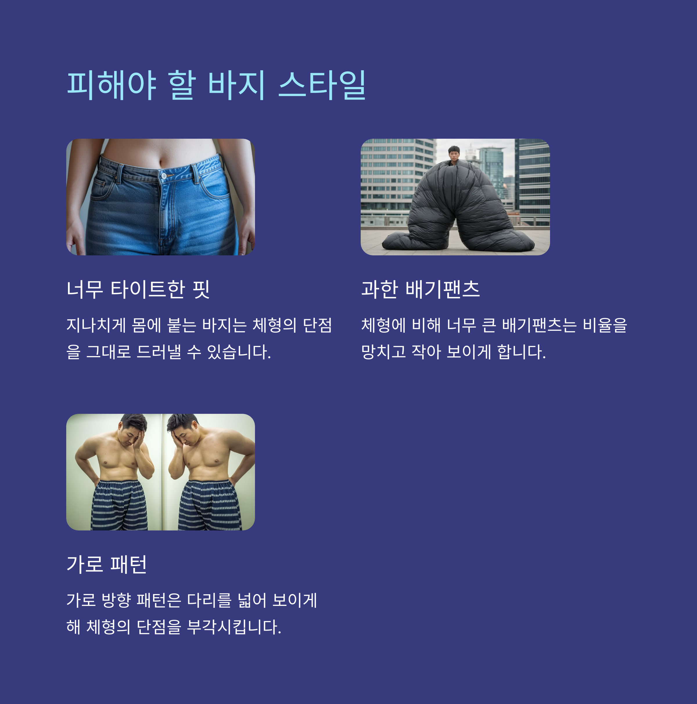 - 피해야 할 스타일: 밝은 컬러의 타이트한 팬츠.