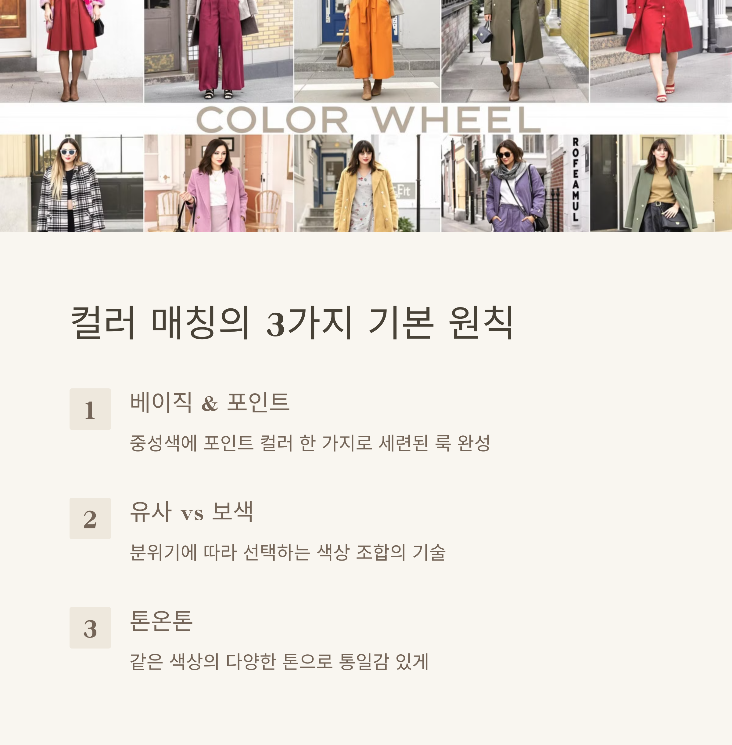 패션에서 컬러 조합은 스타일을 완성하는 중요한 요소입니다. 옷을 잘 입는 사람들은 브랜드나 디자인뿐만 아니라 컬러를 효과적으로 활용해 감각적인 스타일을 연출합니다. 컬러 매칭의 기본 원칙을 이해하면 누구나 세련된 패션을 완성할 수 있습니다.