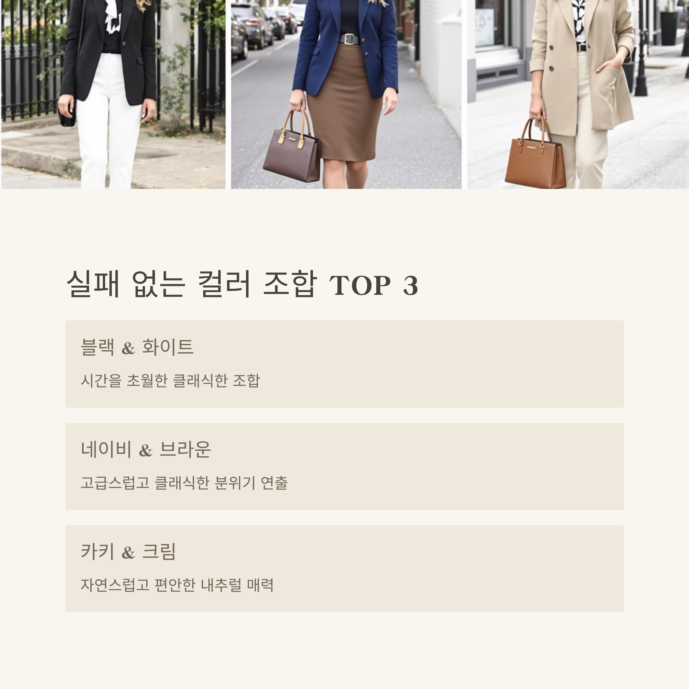 - 블랙, 화이트, 베이지: 어디에나 잘 어울리는 기본 컬러 조합