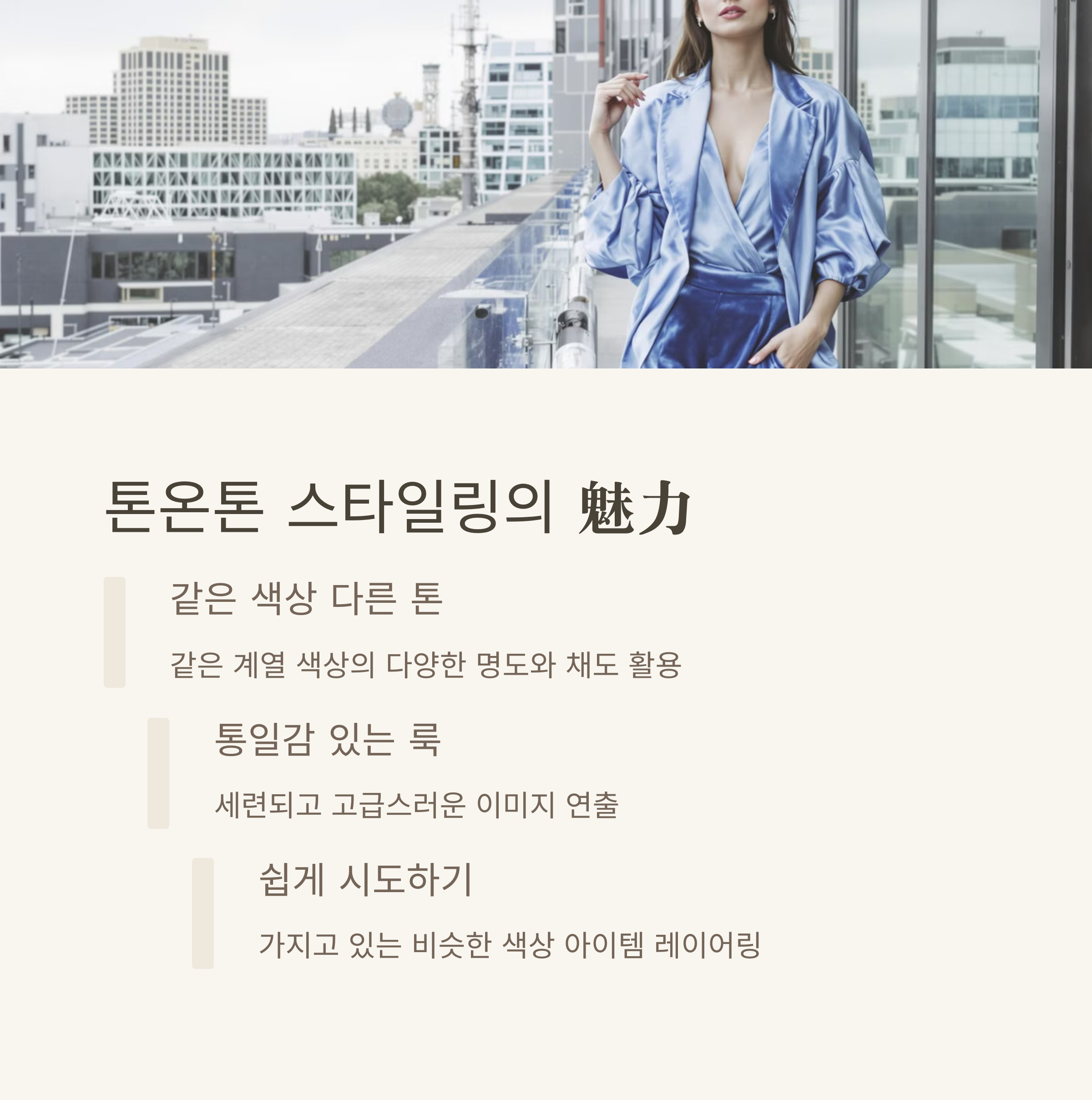 - 모노톤 룩: 같은 계열의 색상으로 통일감을 주는 스타일