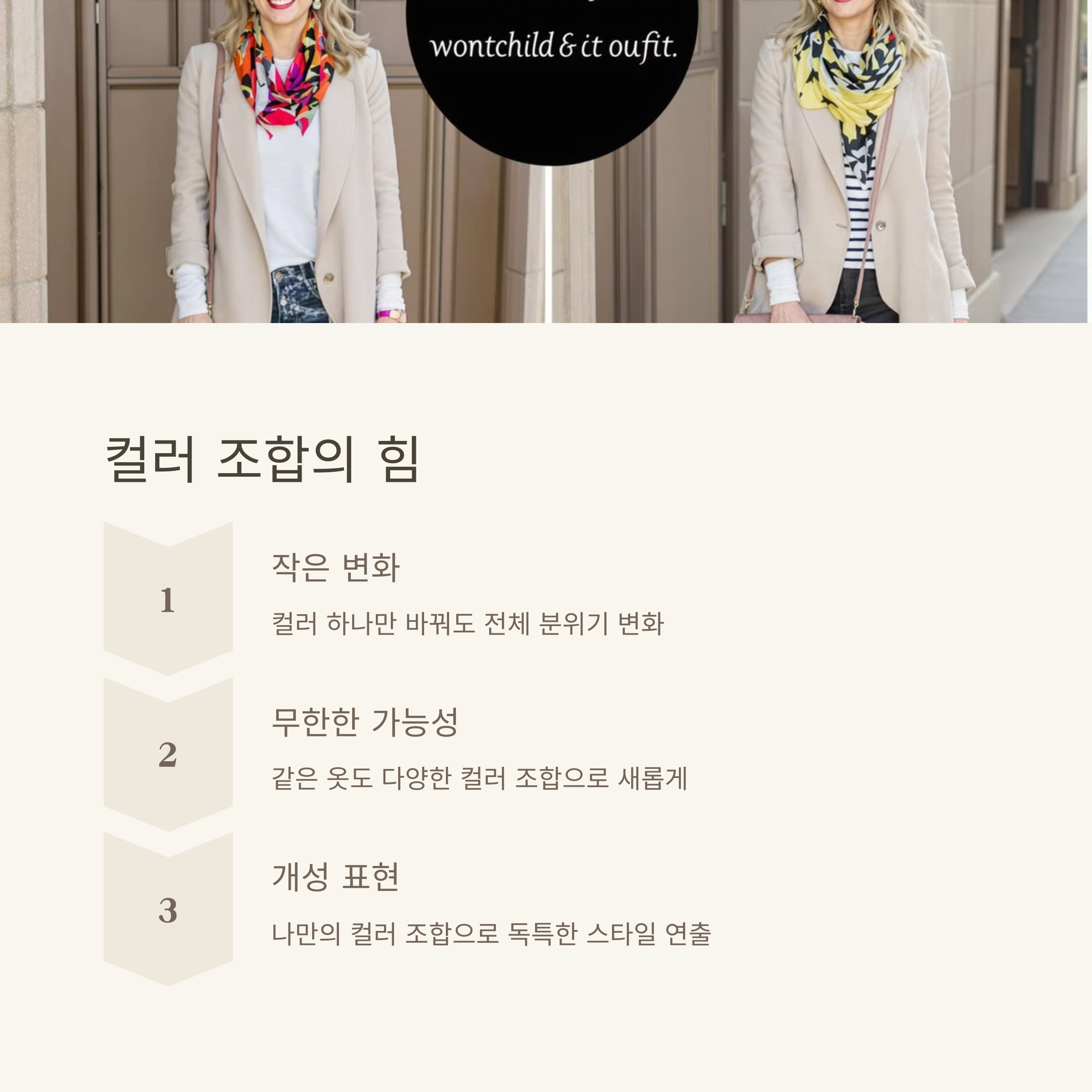- 베이직 컬러와 포인트 컬러 조화: 블랙, 화이트, 베이지 같은 기본 컬러를 활용하고 포인트 컬러를 추가해 스타일을 완성합니다.