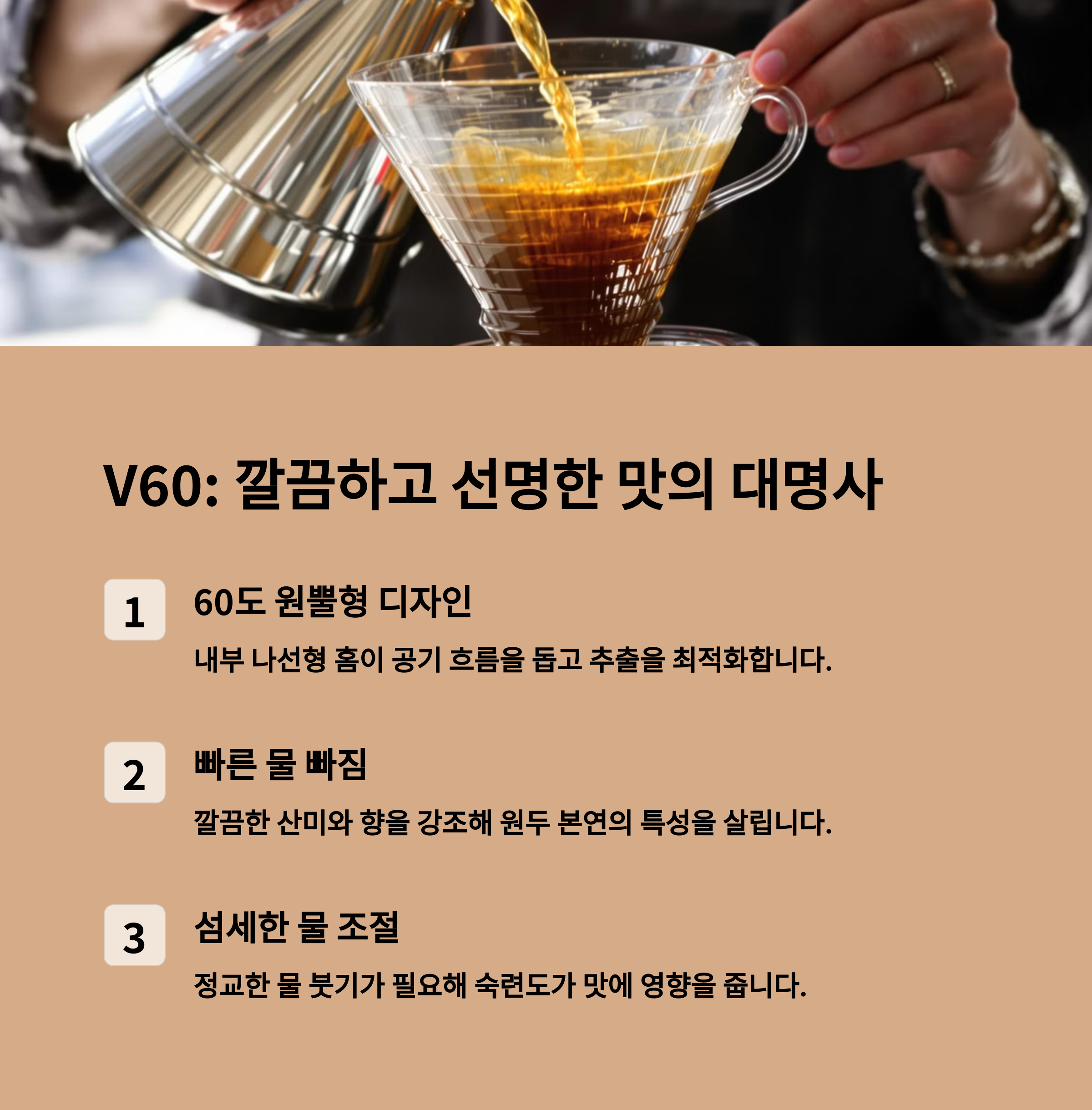 - V60은 빠른 물 빠짐으로 가벼운 느낌과 산미가 강조됨
