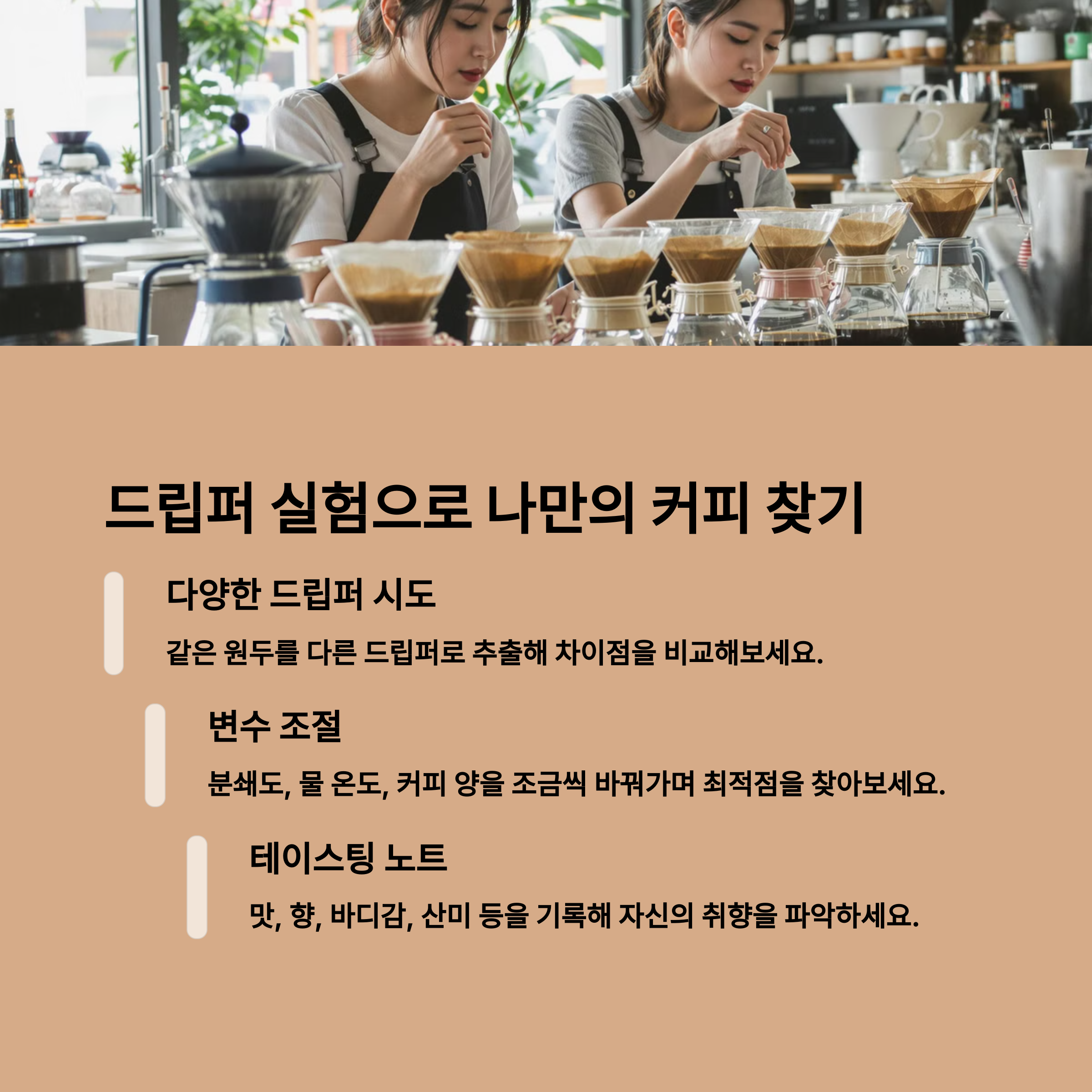 자신에게 맞는 드립퍼를 찾아 직접 비교해보는 것도 좋은 경험이 될 것입니다.