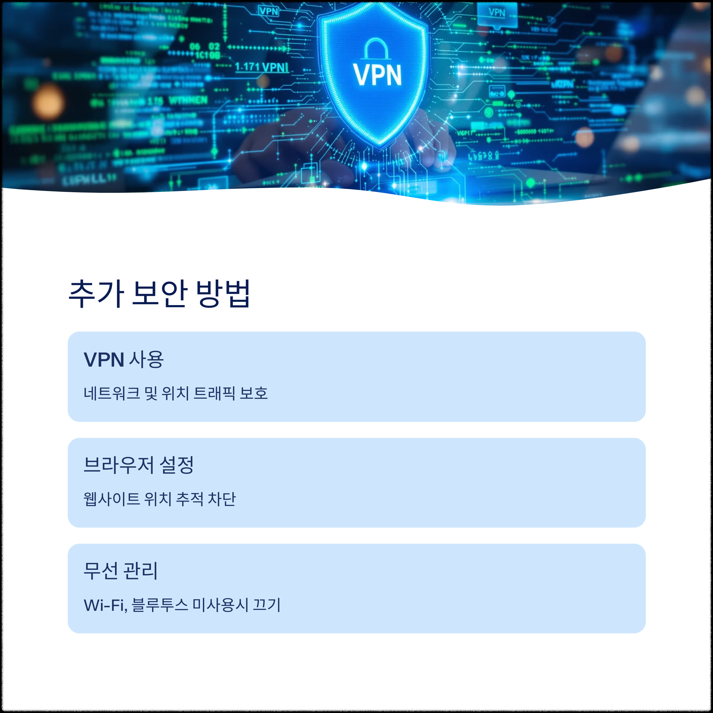 위치 설정을 꺼도 모든 보안이 해결되진 않습니다. 공용 와이파이 사용 시 VPN을 함께 활용하고, 앱 설치 시 권한 요청을 신중히 검토하세요. 또한 주기적으로 위치 권한을 점검하고 오래 사용하지 않는 앱은 삭제하는 것이 개인정보를 보호하는 가장 확실한 방법입니다.