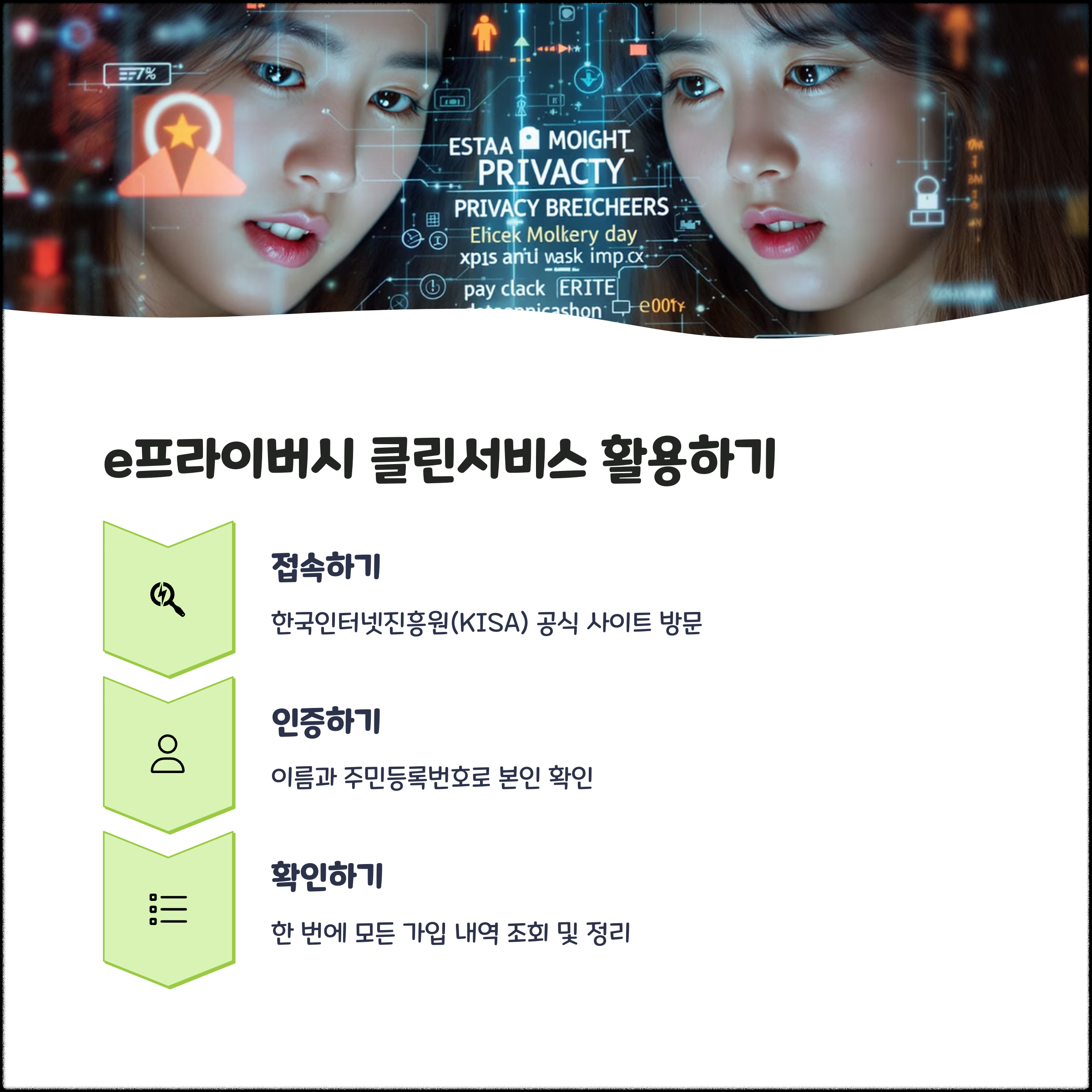 한국인터넷진흥원(KISA)에서 운영하는 ‘e프라이버시 클린서비스’는 내 명의로 가입된 웹사이트 목록을 확인할 수 있는 대표적인 서비스입니다.