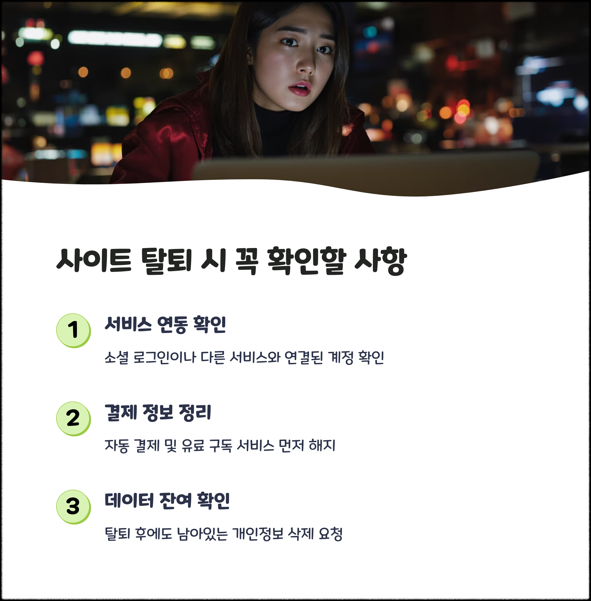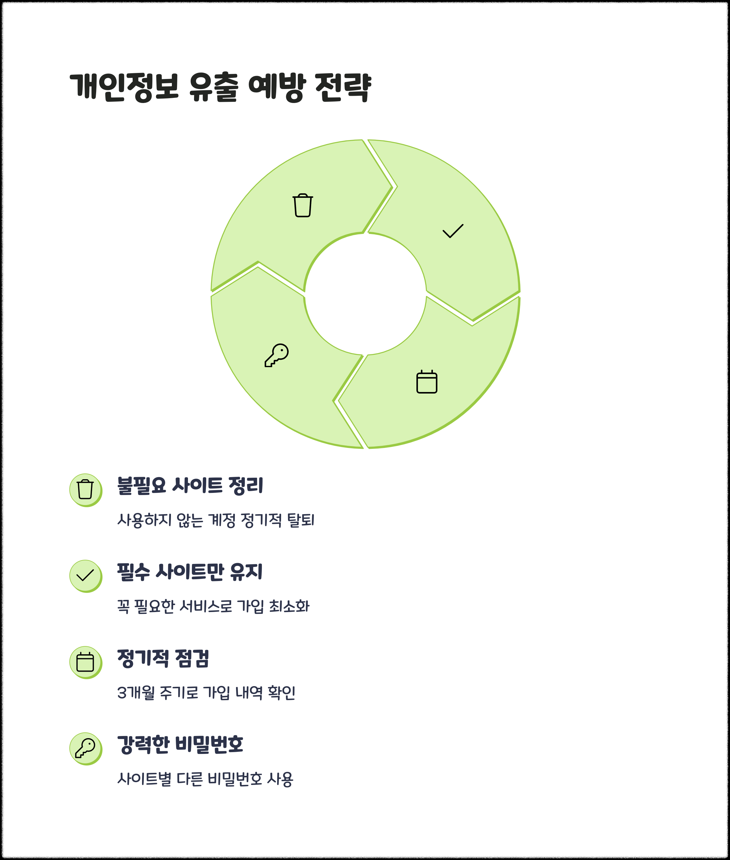 가입된 사이트 중 더 이상 사용하지 않는 곳은 가능한 한 탈퇴를 진행하는 것이 좋습니다. 탈퇴 전에는 보유 중인 개인정보 항목을 확인하고, 탈퇴 이후 정보가 남지 않도록 ‘완전 삭제 요청’ 여부도 확인하세요. 일부 사이트는 이메일 문의나 전화로만 탈퇴가 가능하므로 꼼꼼하게 정리하는 것이 필요합니다.