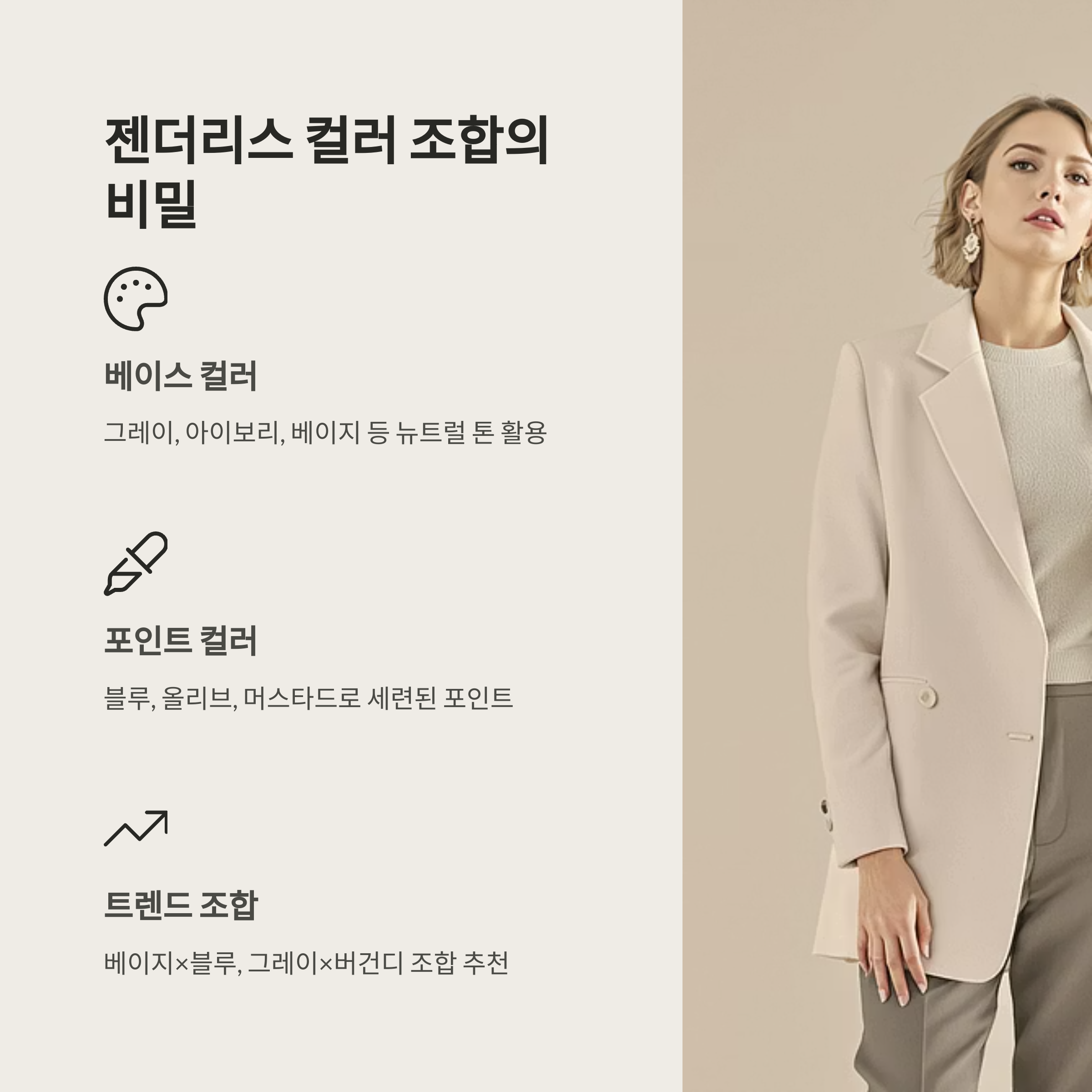 중성적인 분위기를 주는 컬러가 핵심입니다. 그레이, 아이보리, 카키, 네이비, 라벤더 같은 컬러는 성별 구분 없이 누구나 소화 가능하고 감성적인 무드를 전달합니다. 톤다운된 컬러 조합은 안정적이고 깔끔한 인상을 줍니다.