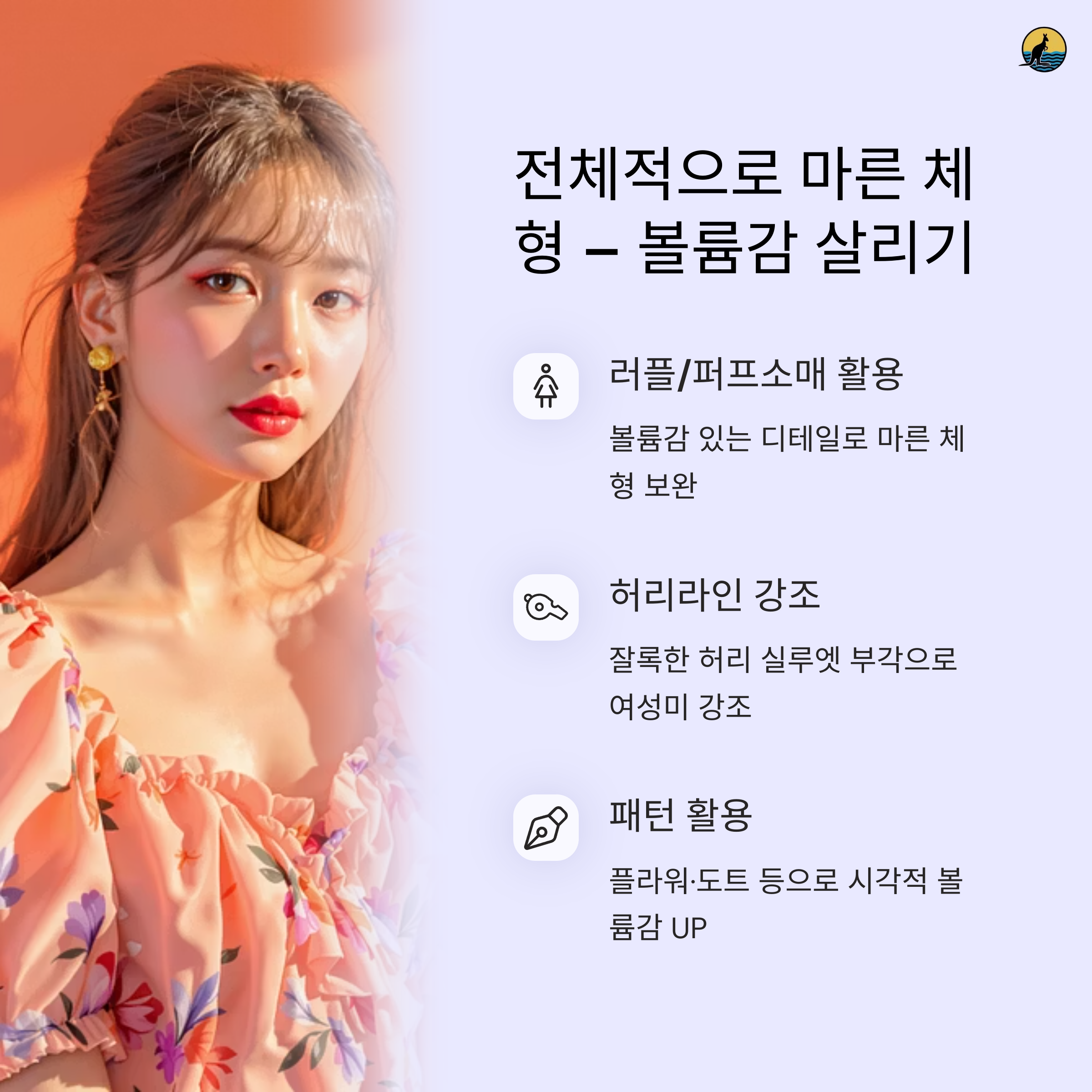전체적으로 마른 체형은 슬림하고 길어 보이지만 자칫하면 너무 빈약해 보일 수 있다는 단점이 있습니다 이런 체형에는 러플이나 셔링이 들어간 디자인처럼 자연스럽게 볼륨감을 살려주는 디테일이 중요합니다