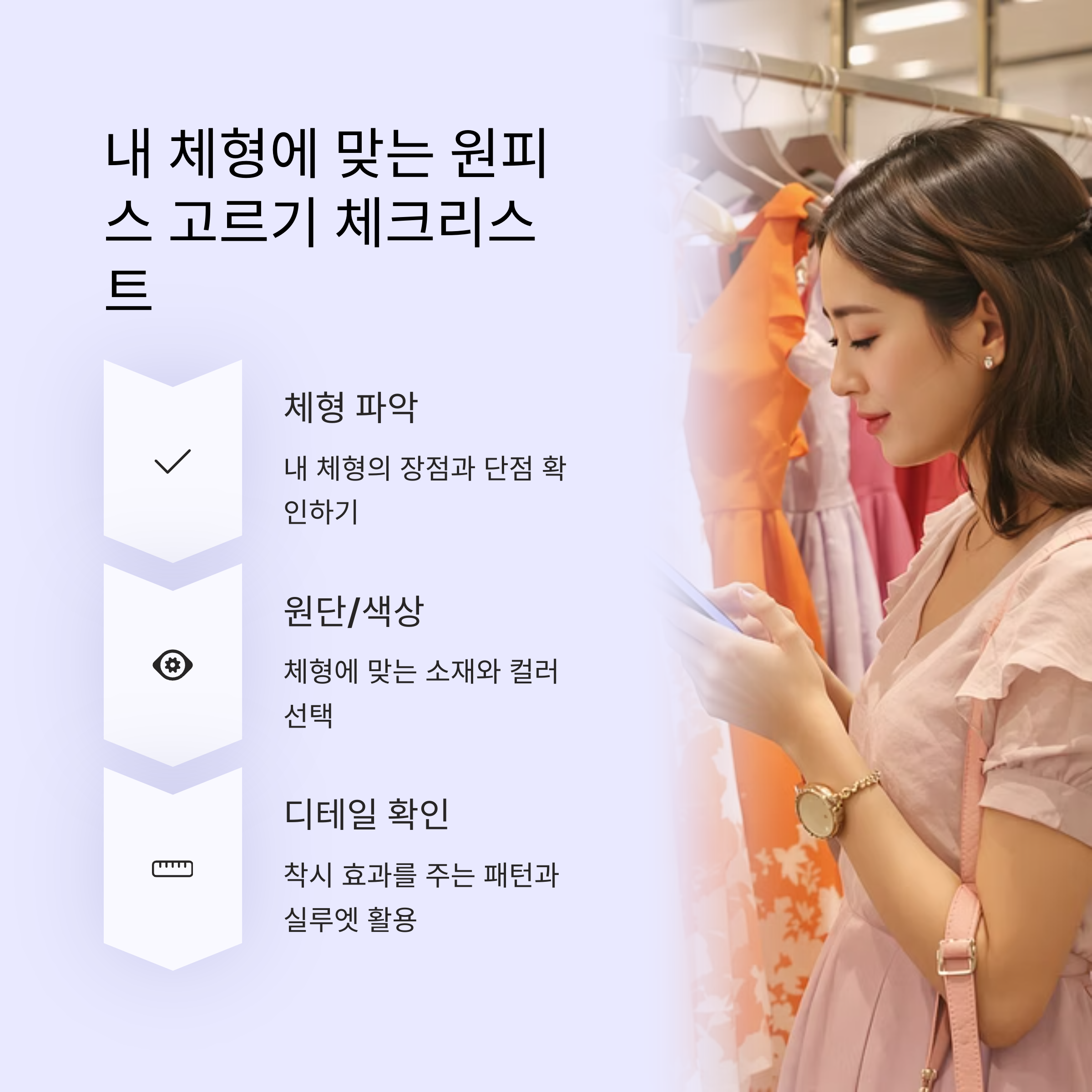 지금까지 다양한 체형에 맞는 원피스 스타일을 정리해보았습니다 하지만 모든 체형이 하나로 딱 떨어지진 않죠 그래서 마지막으로 전체적인 체크리스트를 정리해볼게요