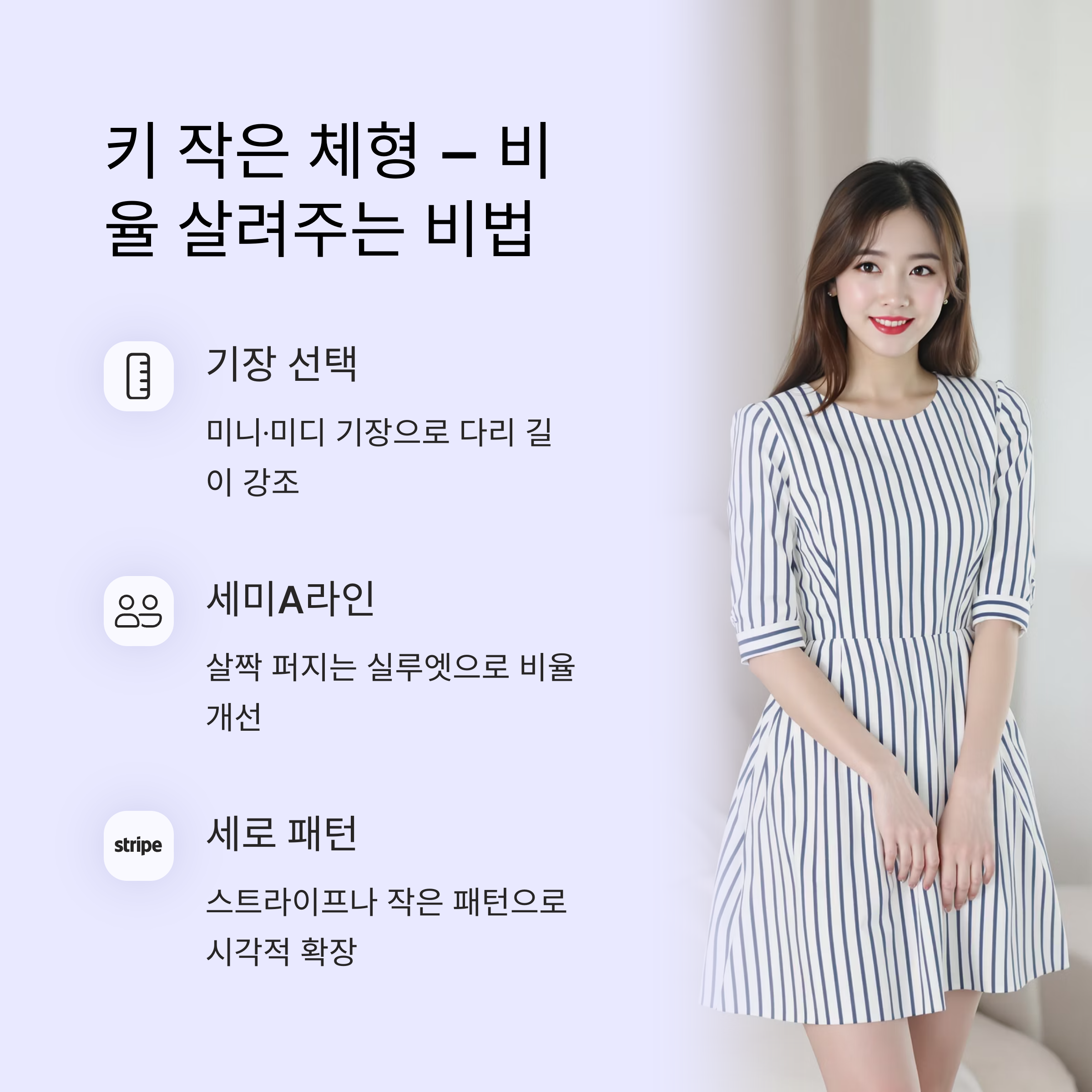 작은 키의 체형은 전체 비율을 어떻게 맞추느냐가 가장 중요합니다 무릎 위로 오는 짧은 기장이나 허리선이 위쪽에 위치한 하이웨이스트 디자인은 다리를 길어 보이게 해주는 대표적인 방법입니다