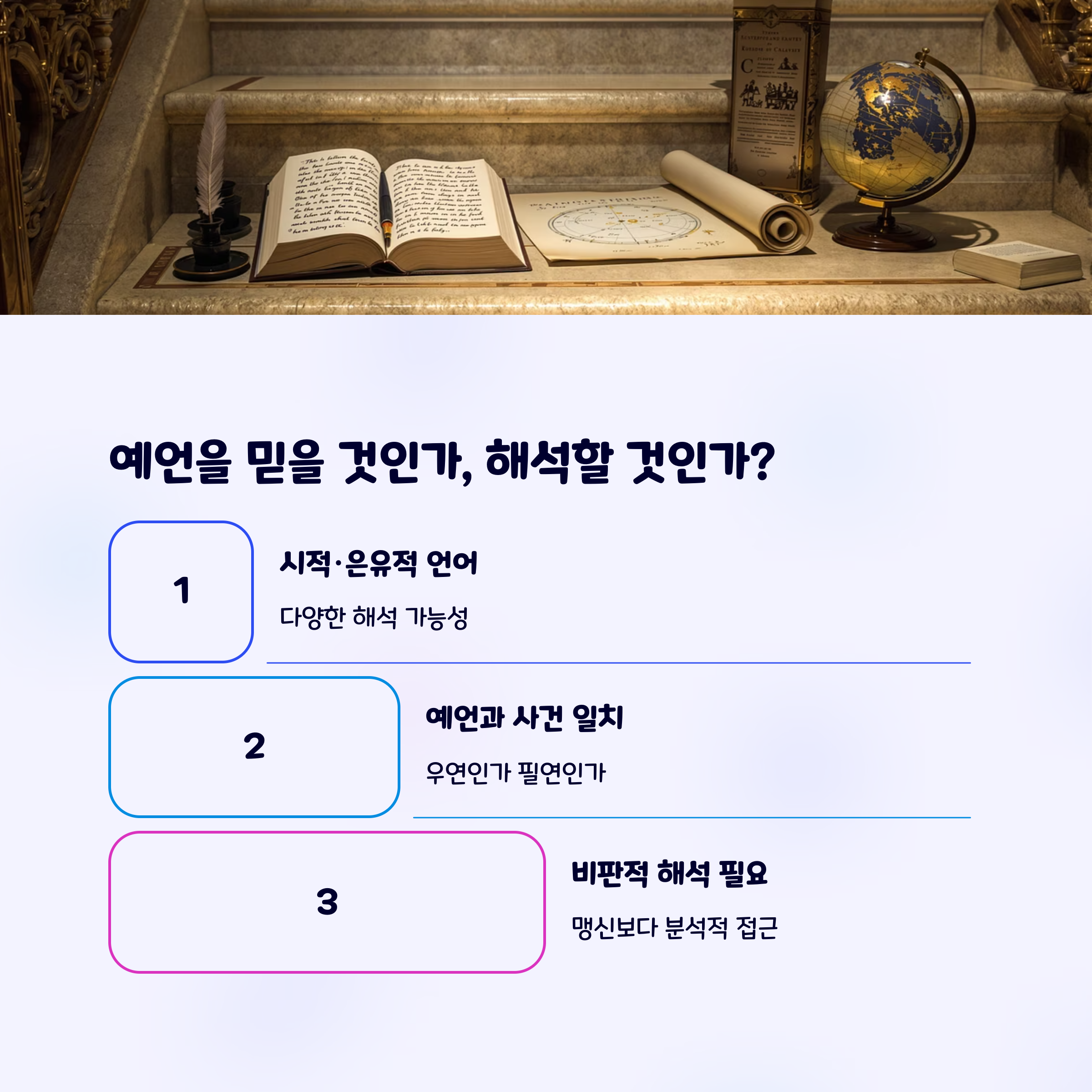 노스트라다무스의 예언은 늘 상징과 은유로 가득하다. 문자 그대로 받아들이면 그저 공포를 조장하는 글에 불과하지만, 그가 남긴 시들을 하나의 거울처럼 해석하면 오히려 우리가 놓치고 있는 사회적 징후와 심리를 되짚어볼 수 있다. 예언은 두려움보다 성찰을 이끄는 계기가 되어야 하며, 지금 우리 사회가 직면한 혼란과 위기의 본질을 되돌아보게 하는 도구가 될 수도 있다.