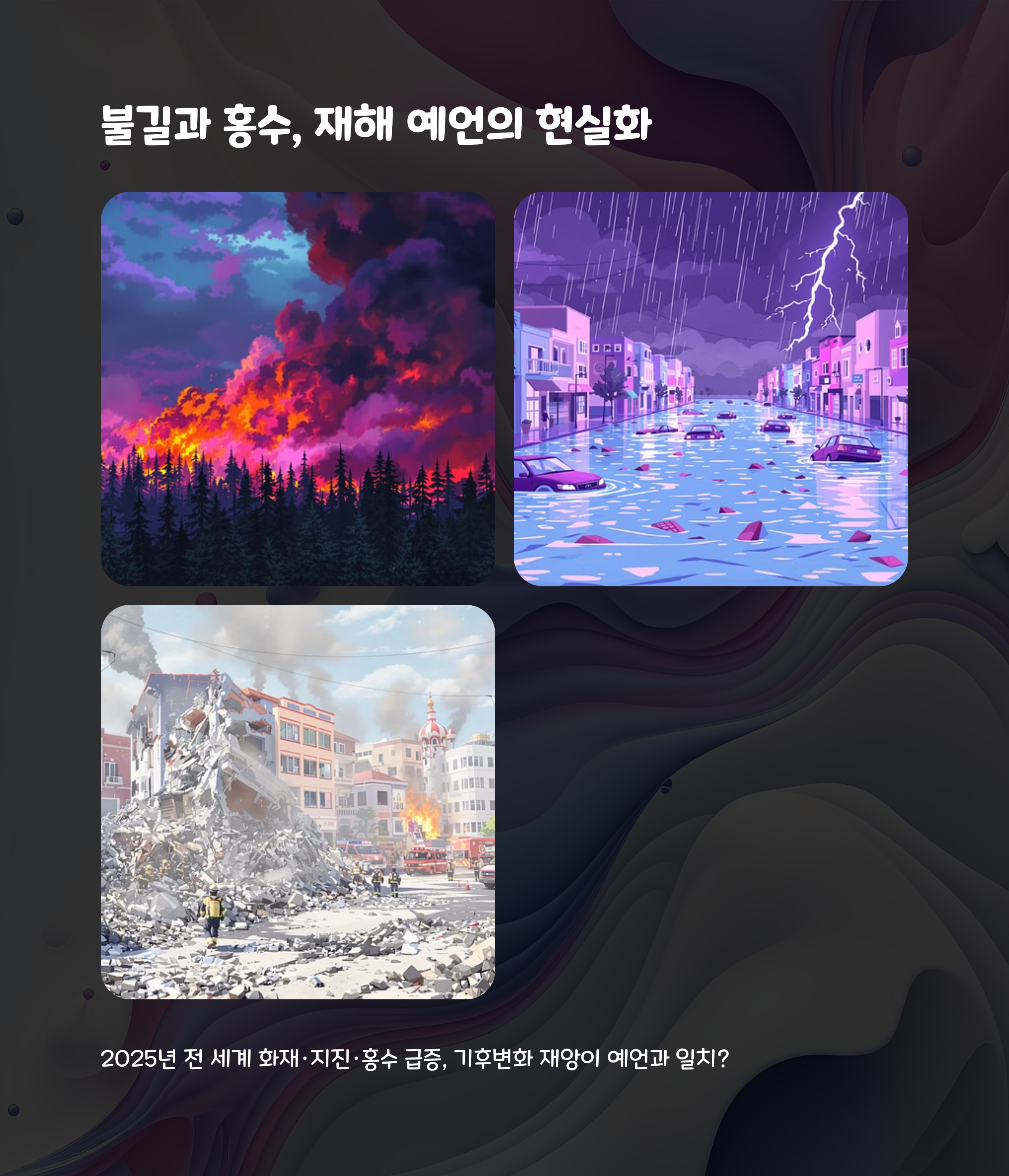 노스트라다무스는 2025년을 ‘엄청난 불길’과 ‘해안 대도시를 황폐화할 홍수’가 일어나는 해로 묘사했다. 이러한 묘사는 올해 미국 캘리포니아, 캐나다 브리티시컬럼비아, 한국 경남 지역 등에서 발생한 대형 산불과 유사하며, 기후 변화로 인한 홍수 피해 증가와도 맞닿아 있다. 기상이변이 일상화된 지금, 예언의 문장은 점점 더 현실적인 경고처럼 느껴진다.