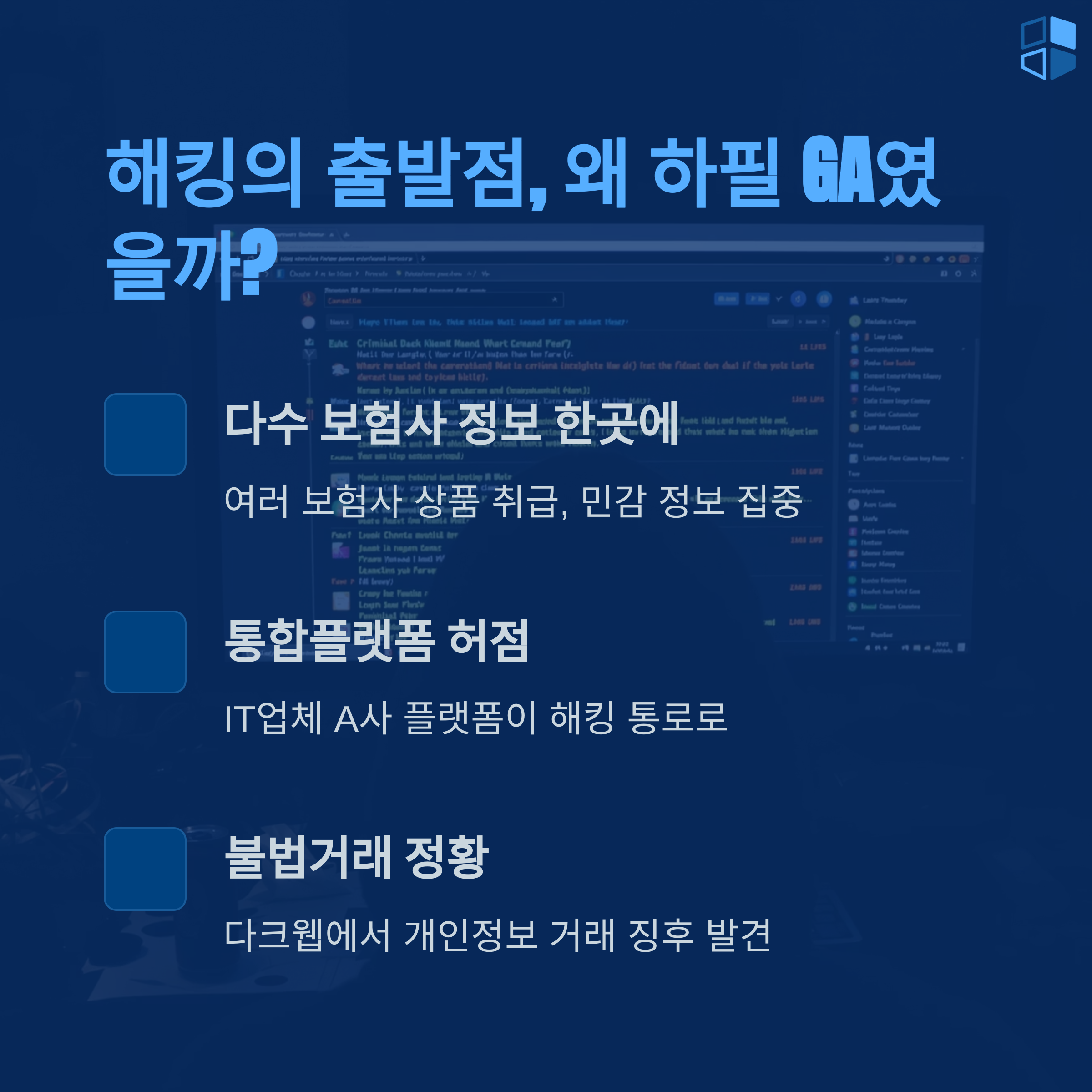 GA(General Agency)는 특정 보험사에 소속되지 않고 다양한 보험사의 상품을 중개 및 판매하는 독립 대리점을 의미합니다. 이번 사건은 이러한 GA 두 곳이 외부 해커의 침입을 받아 내부 전산 시스템이 뚫리는 사고로 시작되었습니다.