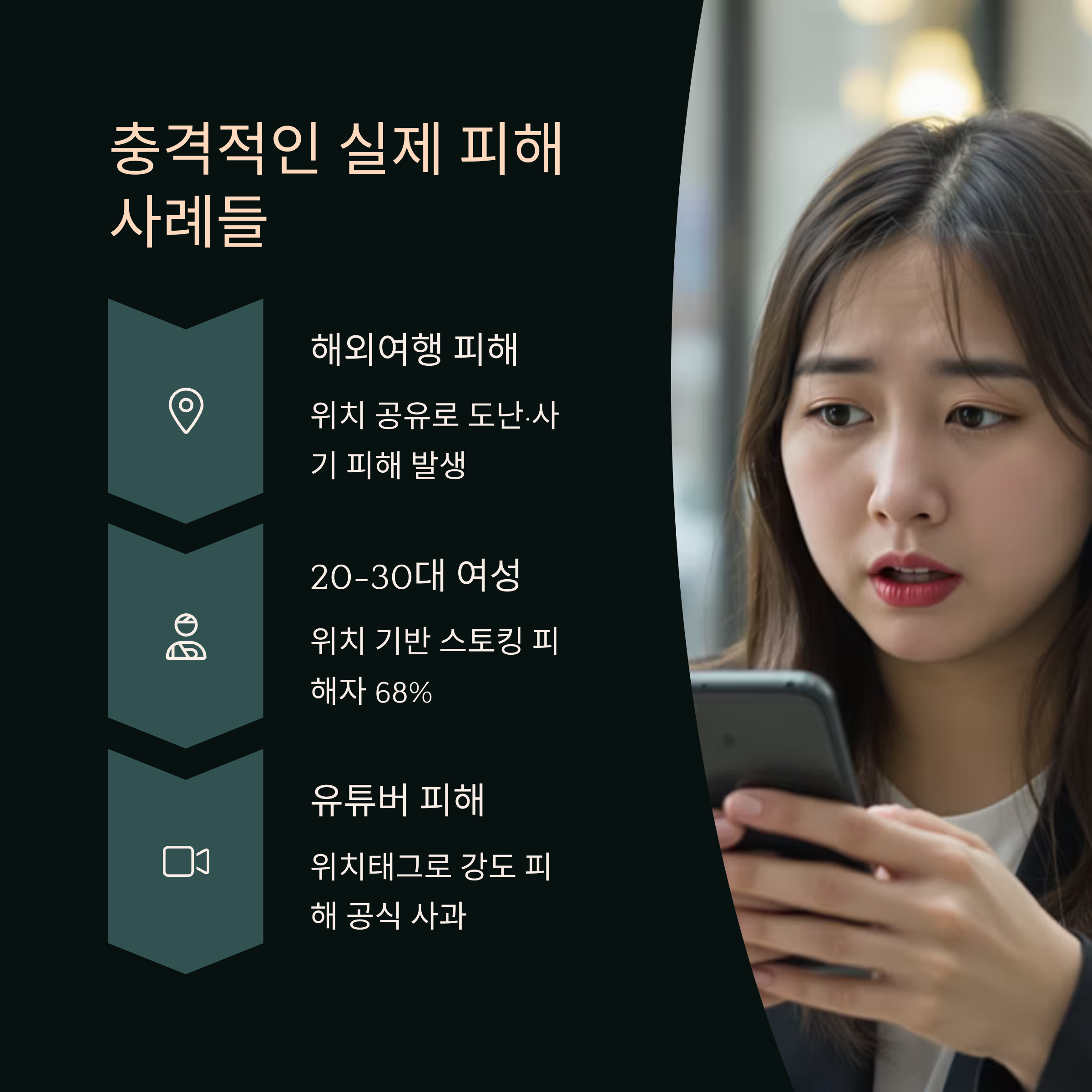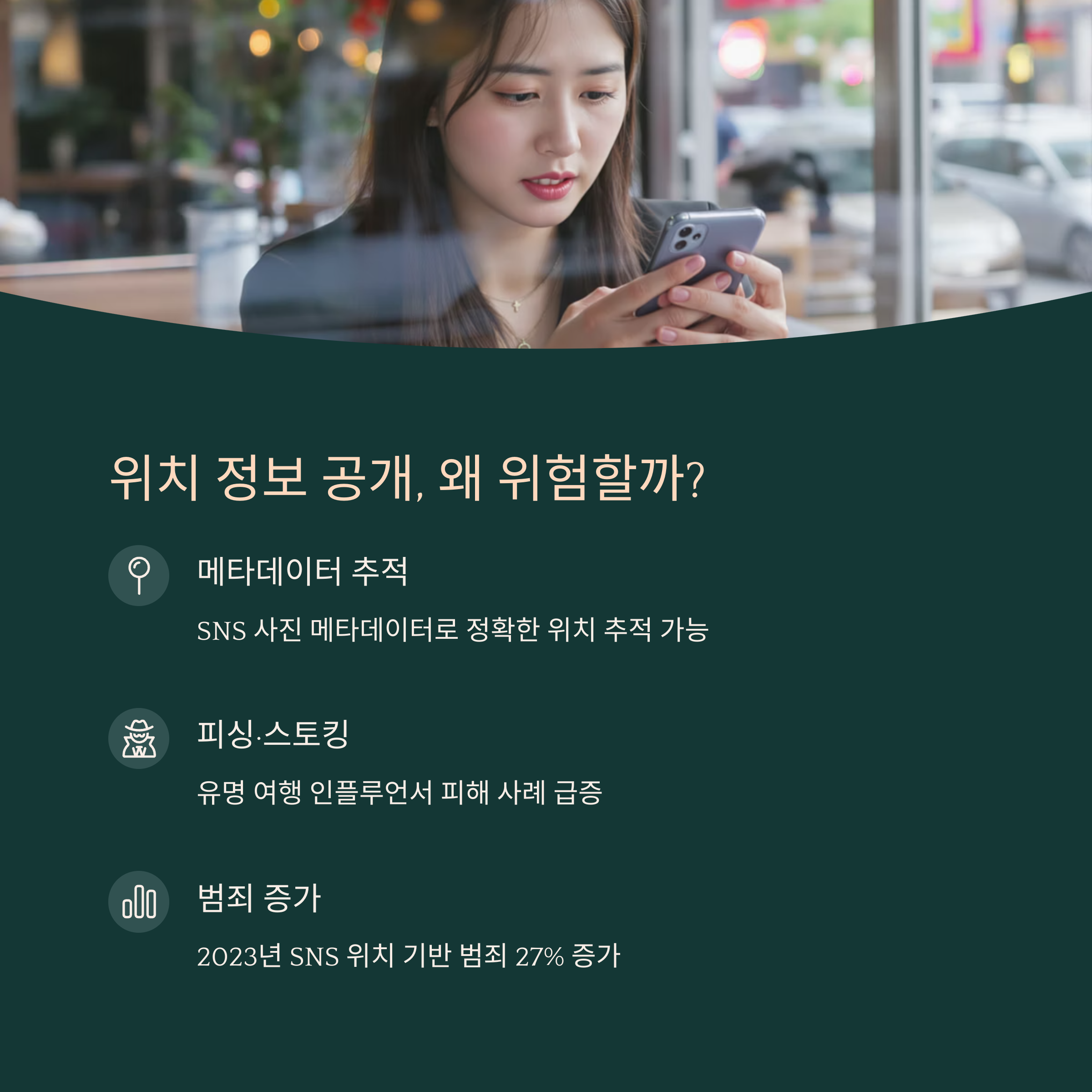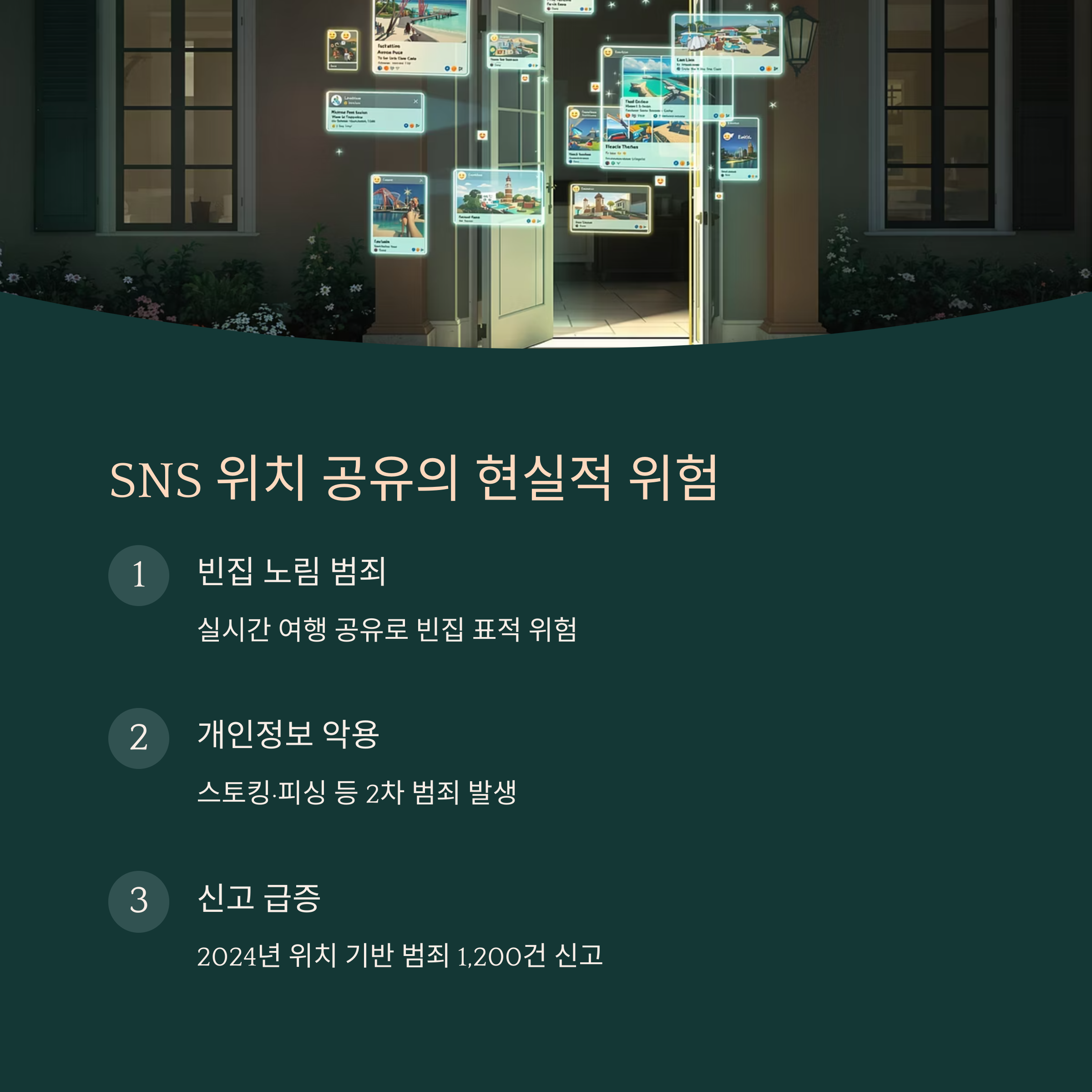 SNS에서 여행 사진을 공유할 때, 위치 정보가 포함되면 그 사진을 보는 사람은 누구나 내가 어디에 있는지 알 수 있습니다. 특히 여행 중에는 내가 혼자 있을 때도 많고, 집을 비운 상태라면 내 집까지 쉽게 추적당할 수 있습니다. 위치 정보는 범죄자에게 내가 현재 어디에 있는지, 언제 집을 비웠는지를 알려주는 중요한 단서가 됩니다. 예를 들어, 여행 중인 동안 집에 도둑이 들 수 있다는 위험이 커지기도 합니다.