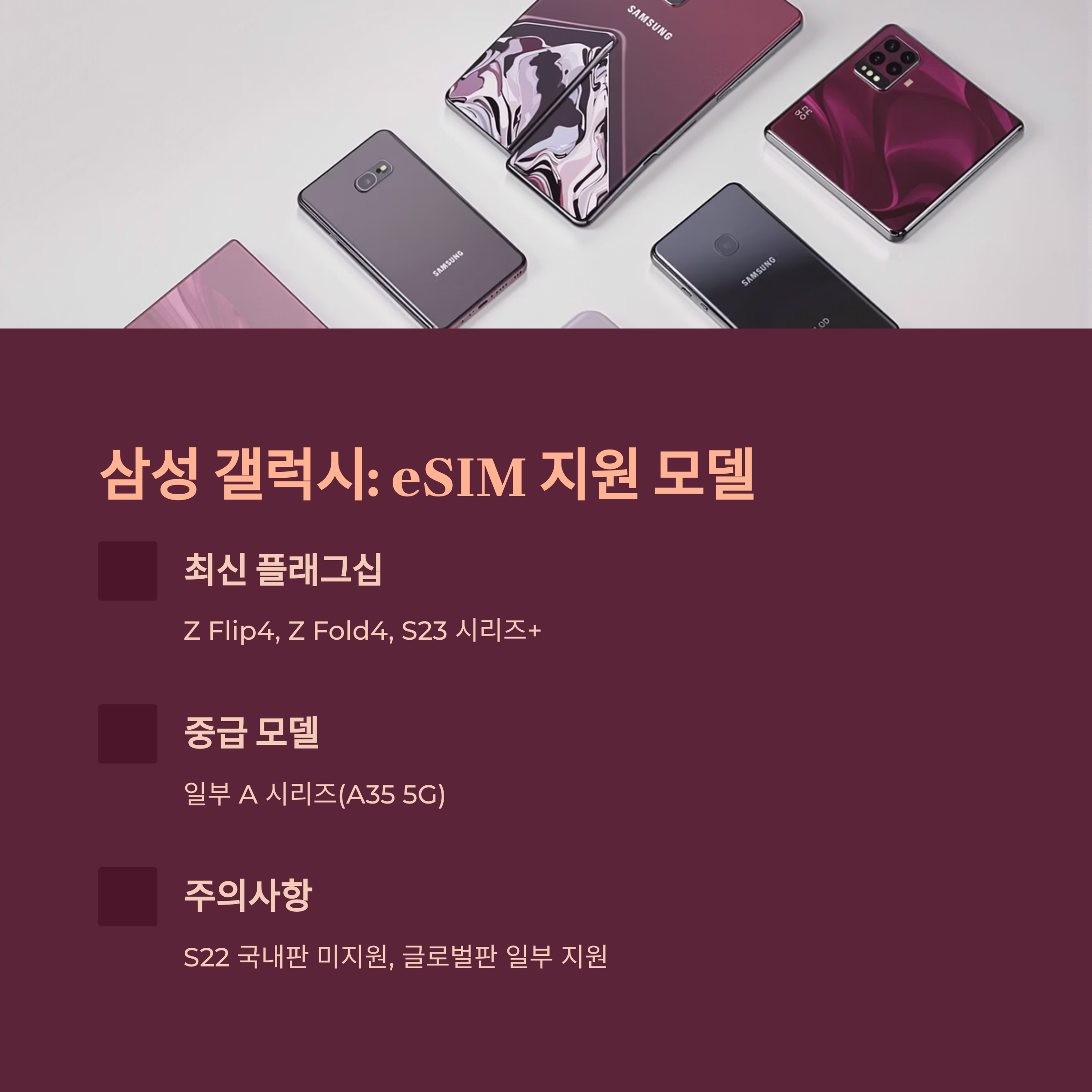 삼성 갤럭시 시리즈는 Galaxy S20부터 본격적으로 eSIM 기능을 탑재하기 시작했습니다. 현재는 플래그십 모델을 중심으로 대부분의 최신 기기가 eSIM을 지원합니다.