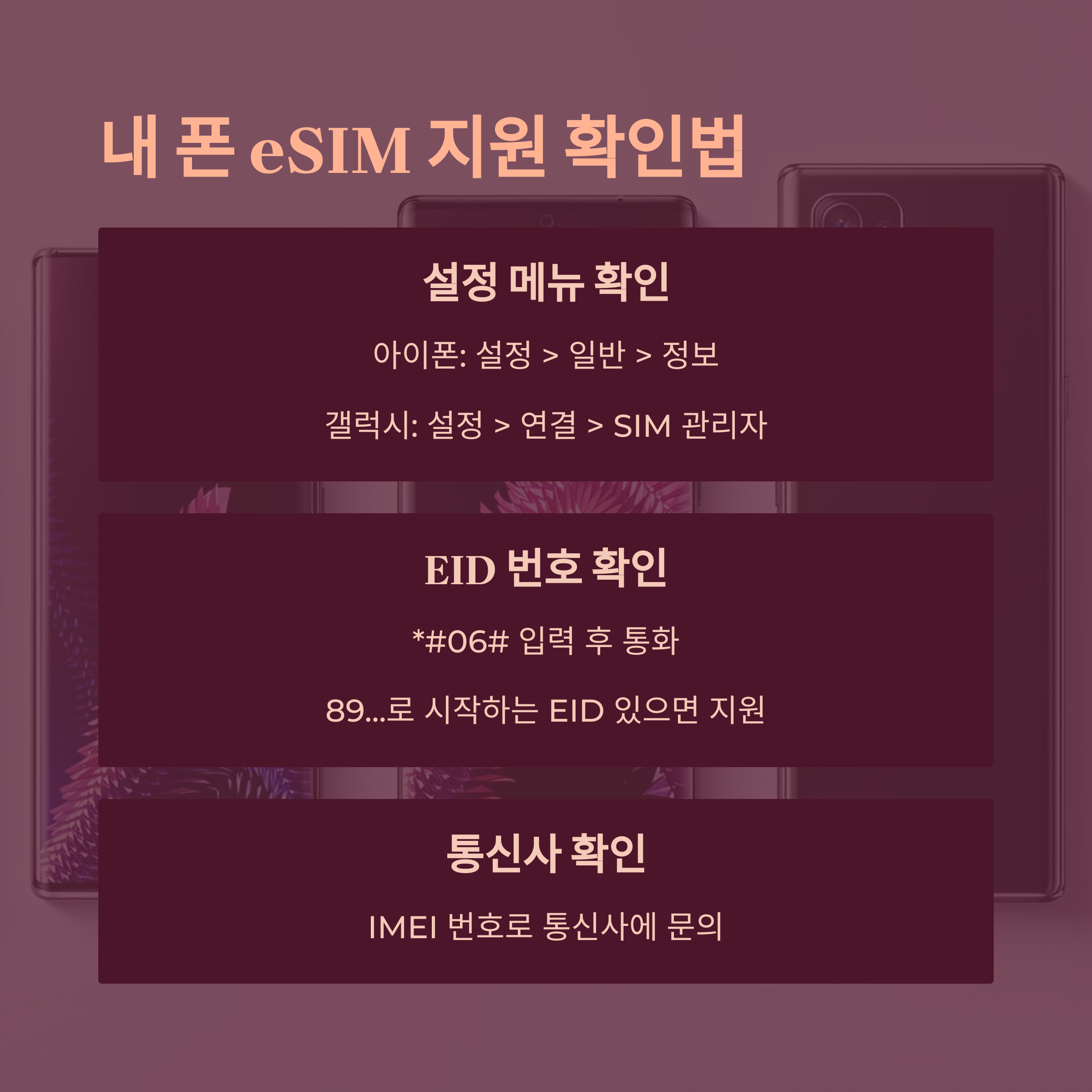 - 전화 앱에서 *#06# 입력 → EID(Embedded ID) 항목이 보이면 eSIM 지원 기기