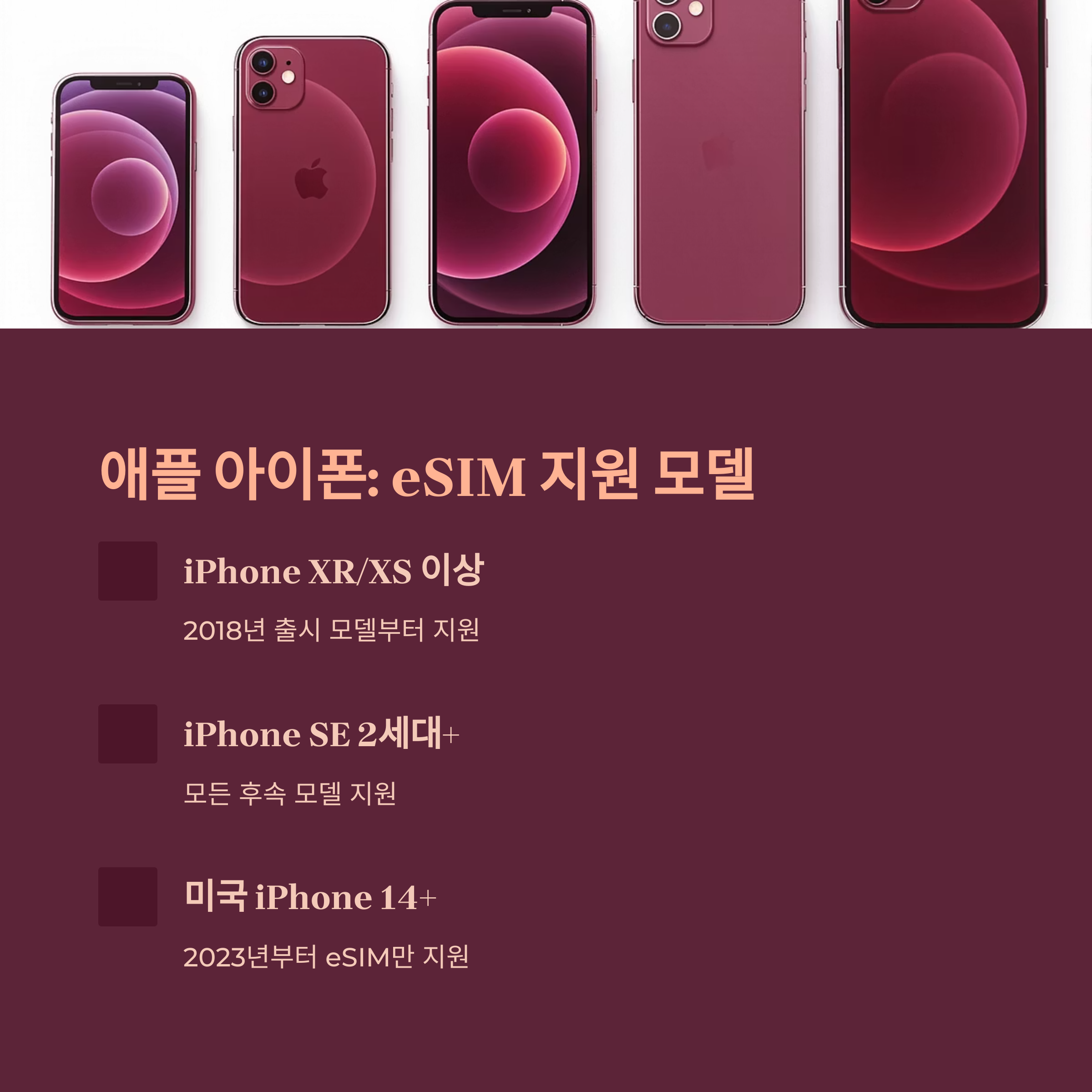 애플은 비교적 빠르게 eSIM을 도입한 브랜드 중 하나입니다. iPhone XR, XS 시리즈부터 eSIM을 지원하며, 특히 미국 출시 iPhone 14 시리즈 이후부터는 물리 유심 슬롯이 제거된 모델도 등장했습니다. 다음은 주요 eSIM 지원 모델입니다.