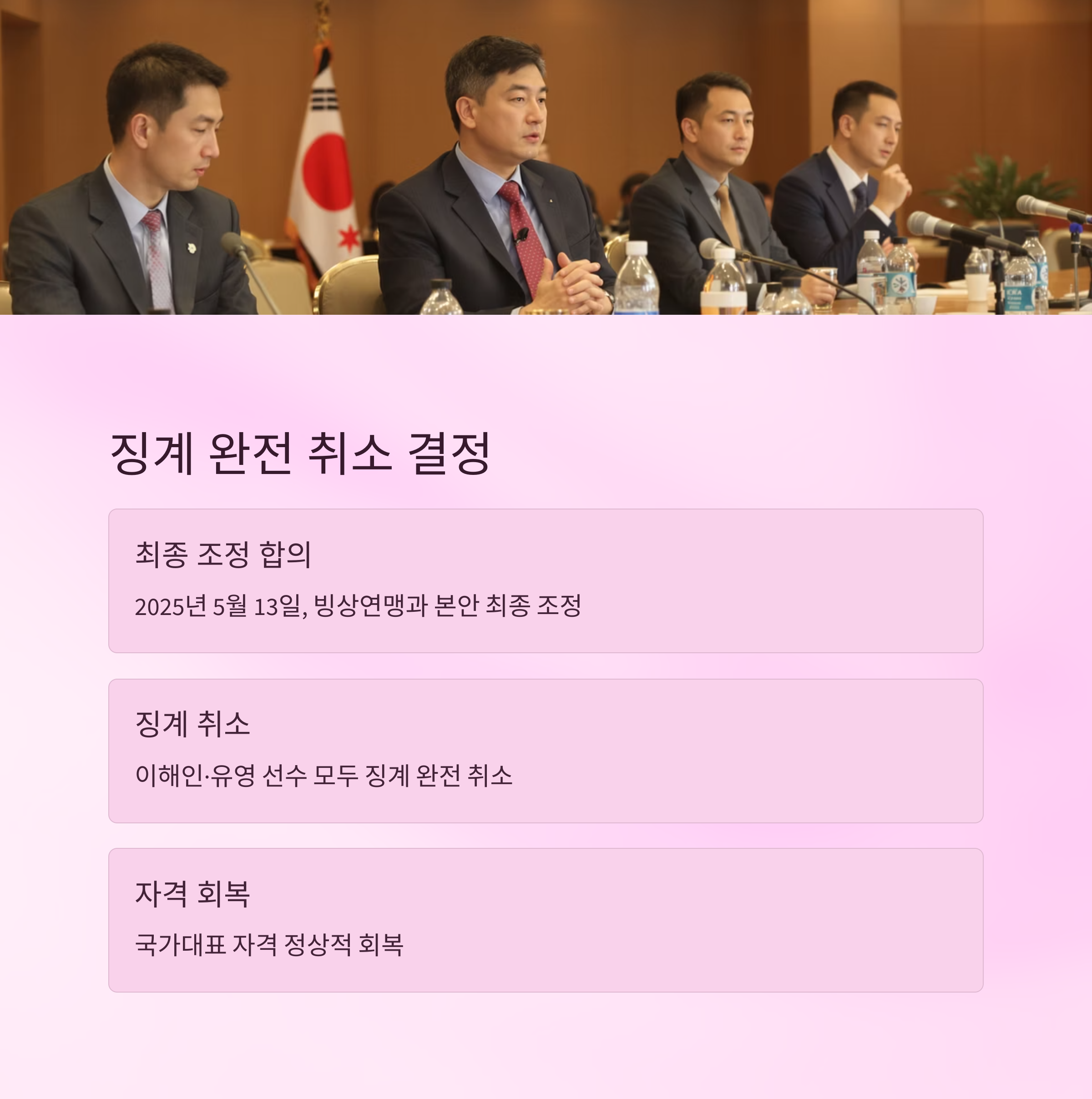2024년 대한빙상경기연맹의 새로운 집행부는 법원의 결정을 존중하며 징계를 공식 취소했습니다. 해당 조정안이 받아들여지면서 이해인과 유영 모두 선수 자격을 회복하게 되었고, 향후 국가대표 선발전 출전도 가능해졌습니다. 이 조치는 스포츠계에서 징계 절차의 투명성과 재량 범위에 대한 논의를 다시 불러일으켰습니다.