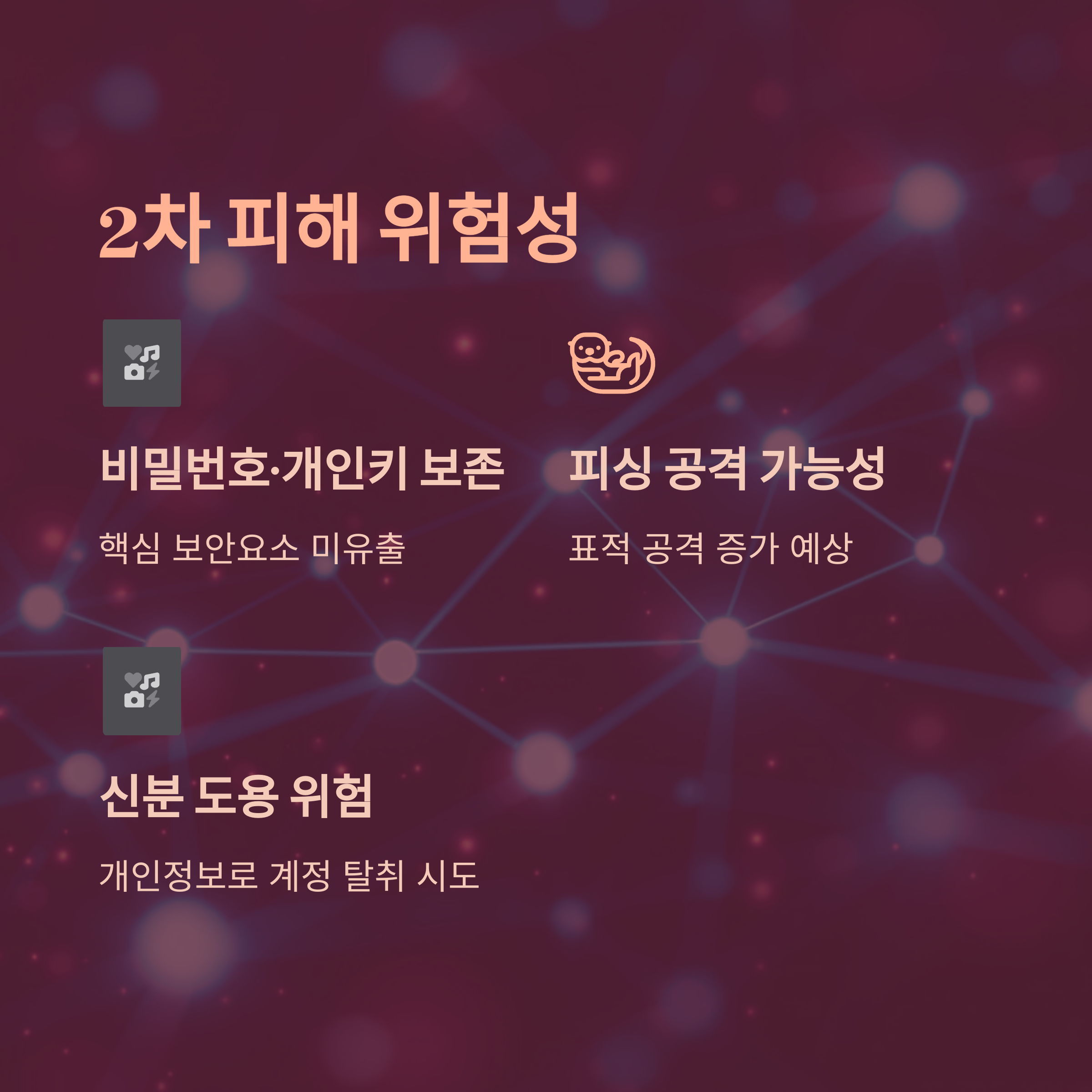 이런 정보는 다크웹을 통해 판매되거나, 스피어 피싱, 계정 도용, 사기 계좌 개설, 금융 사기 등에 활용될 수 있습니다. 특히 암호화폐 계좌 특성상 한 번 탈취되면 추적과 회수가 어렵기 때문에 사용자 피해는 더 커질 수 있습니다.